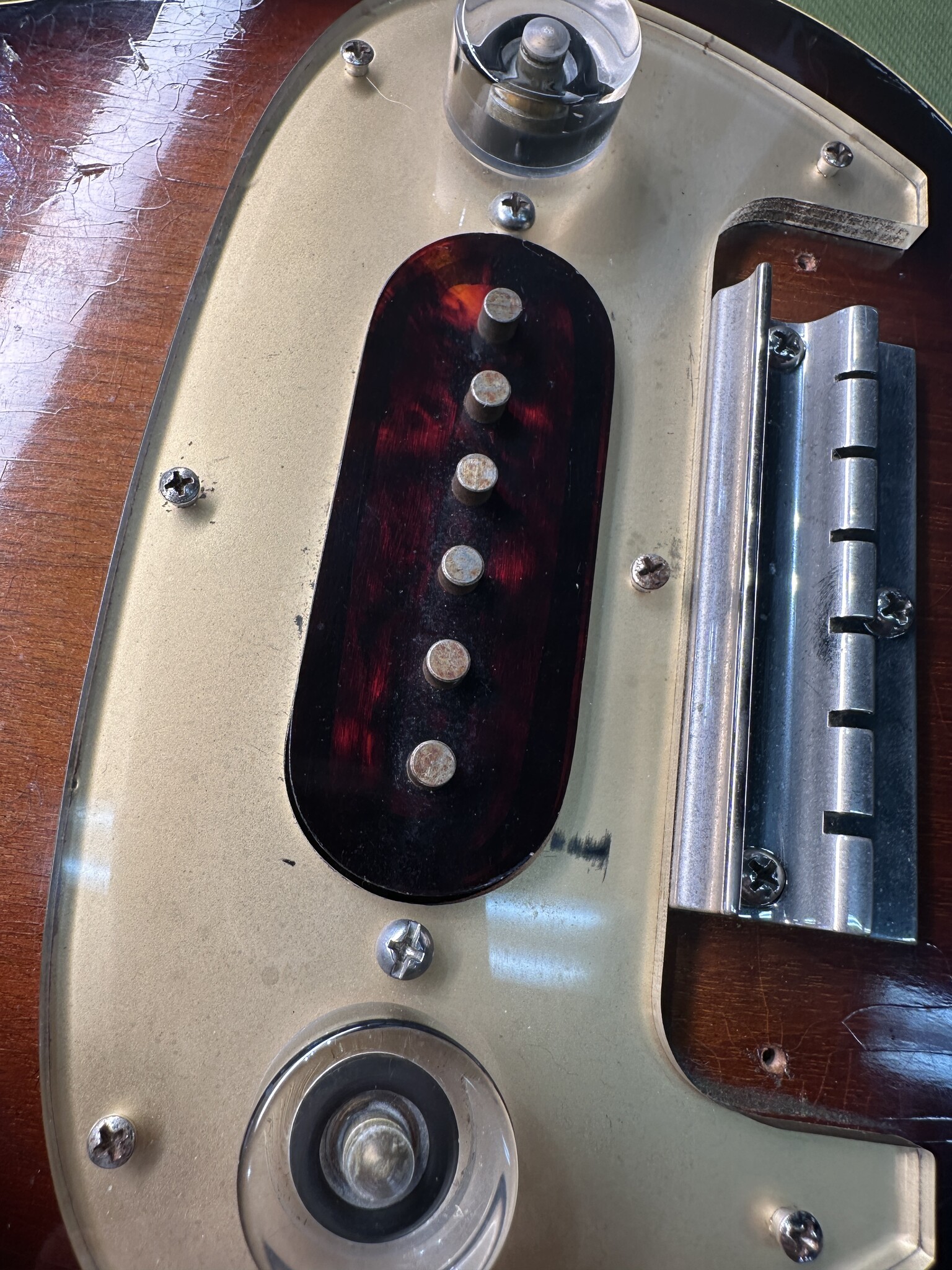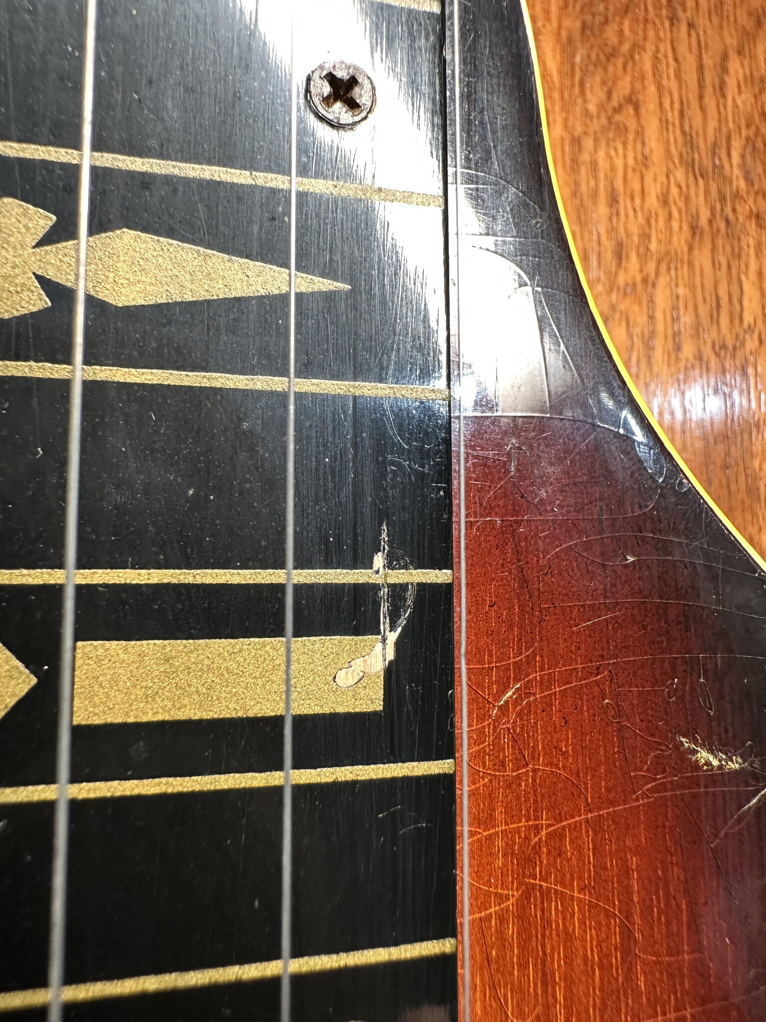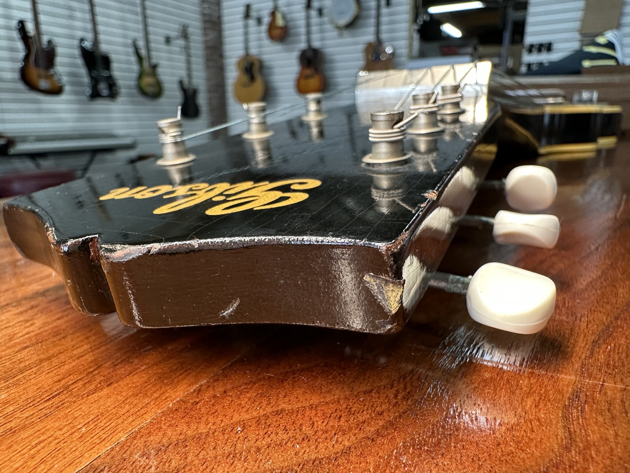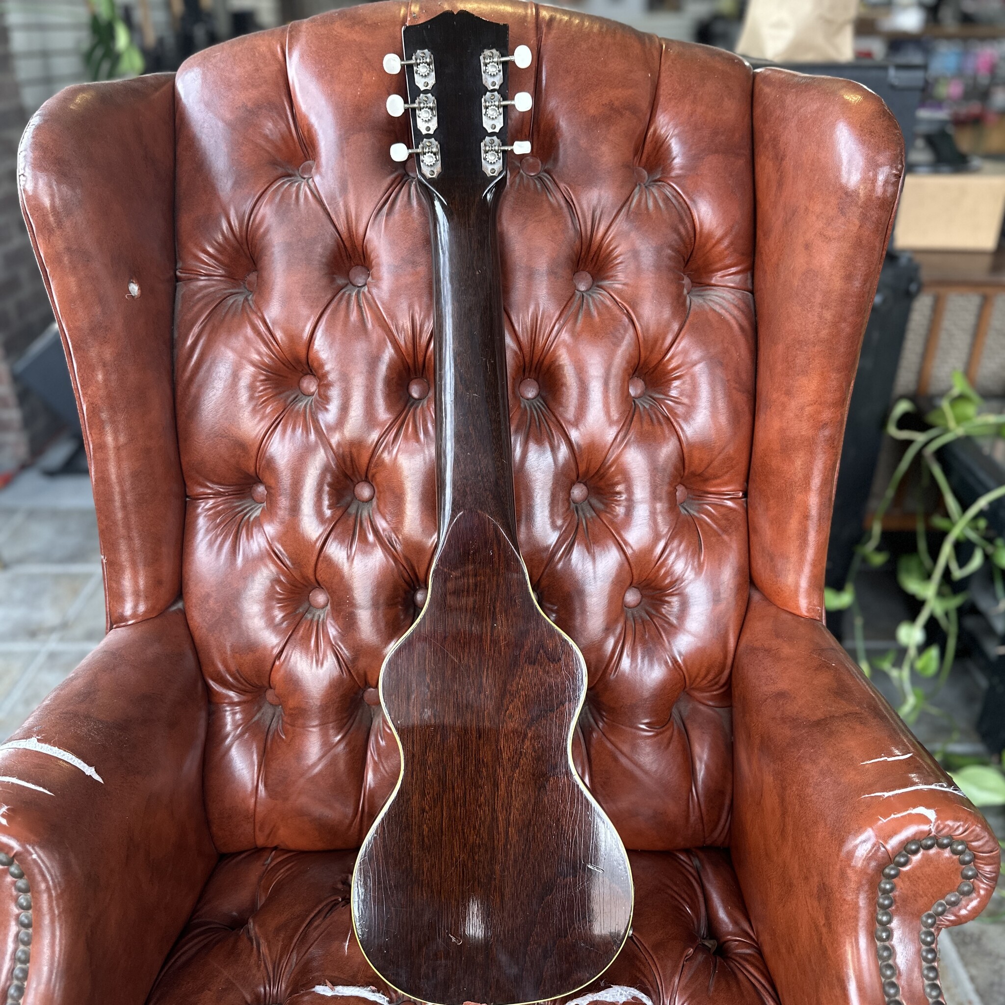 These lap steels are considered a transition guitar, as they have the "pre-war" shape but with a new-for-the-time P-90 style pickup. The body is made of mahogany while the fretboard is stained maple and is double bound, a key feature that differentiates it from the BR-3 model. Although many of the BR-4 had a script logo, this one does not, further making it a transitional piece. It also has the clear and black knobs also associated with the BR-3, but the binding makes it a 4! They had a lot going on in Kalamazoo in the late 40s!
