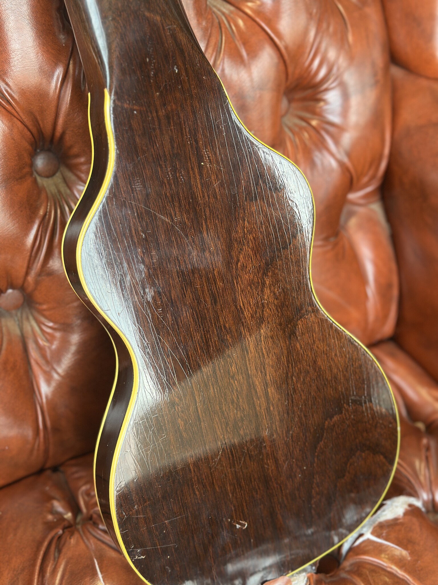 The body of this lap steel is in great shape with tons of beautiful checking. There is some light wear to the fingerboard, but nothing that obscures note markers.