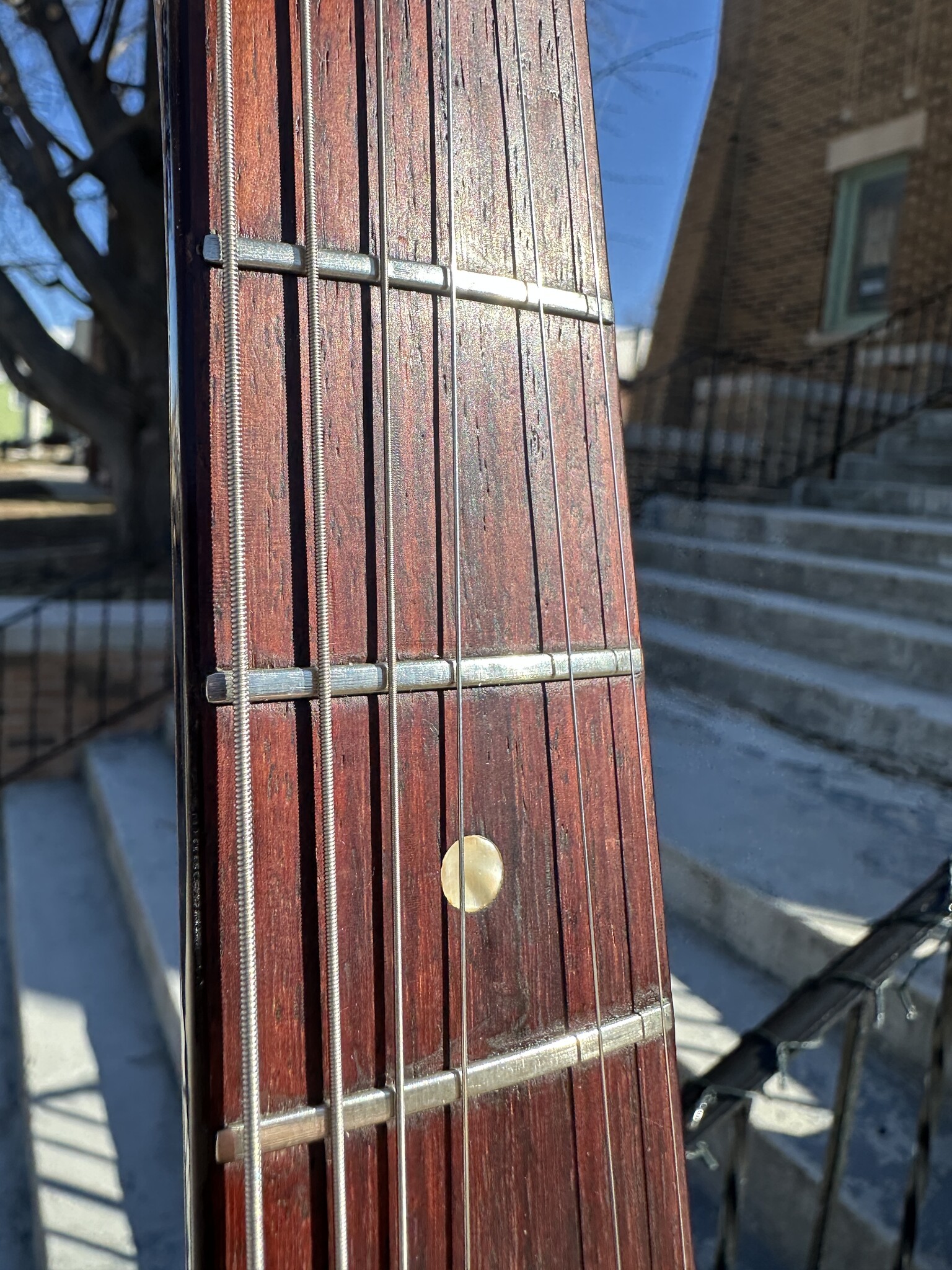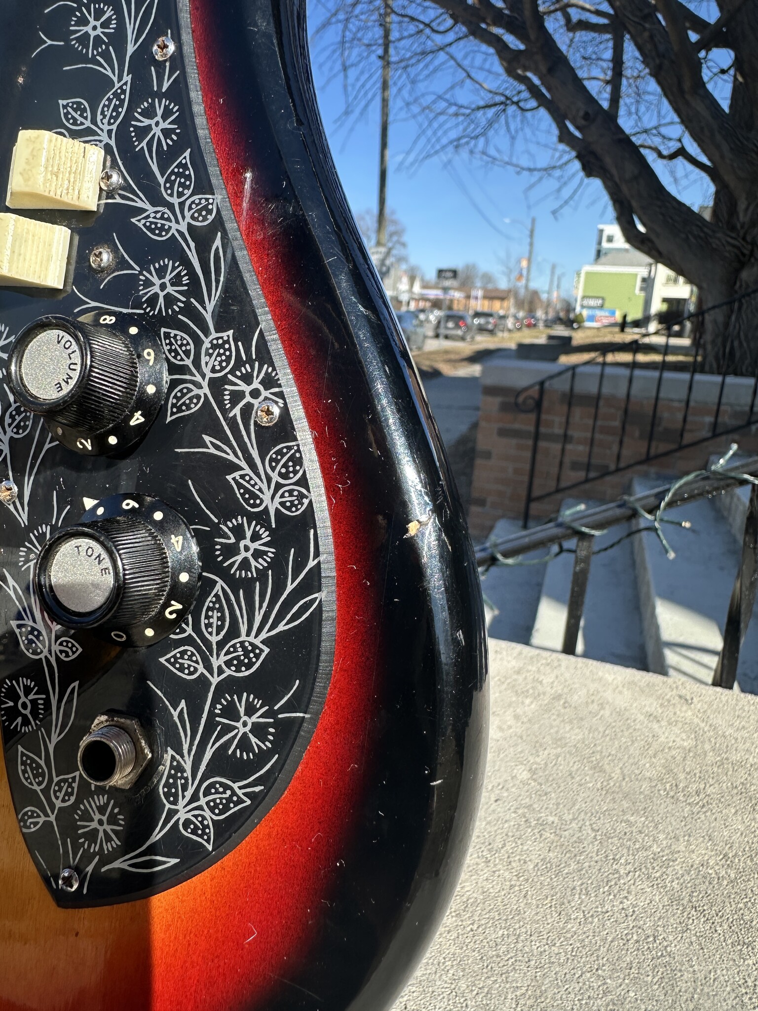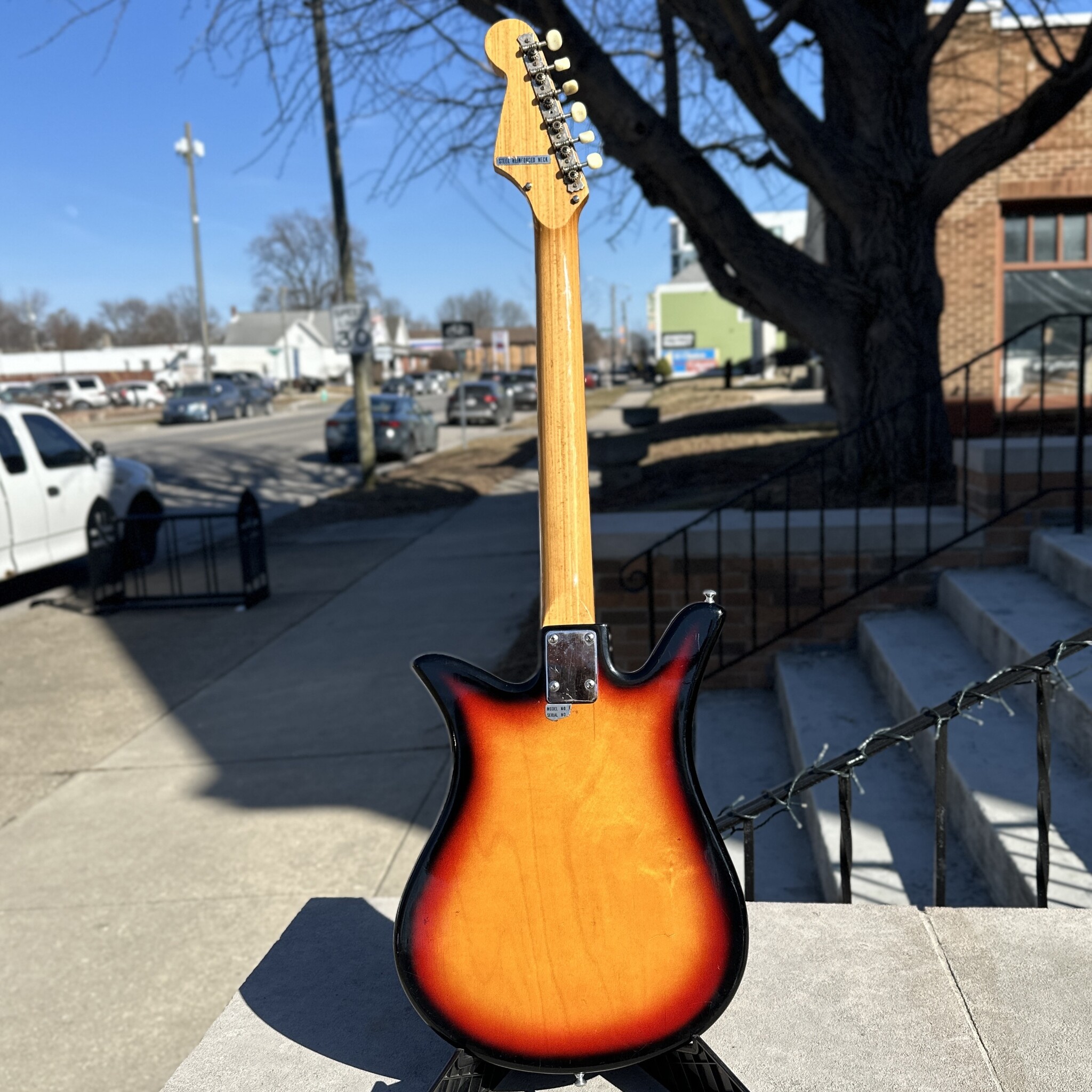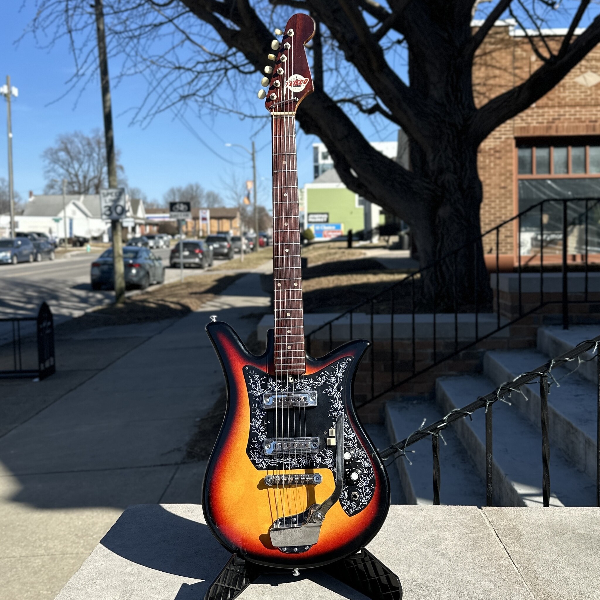 This guitar has lots of charm and sounds great! There is plenty of wear and tear to the body, but nothing that effects playability. The "truss rod" moves. The 2-point rollerbridge is slightly bent on the treble side, but is adjustable on either side. Electronics work! A new spring was added for the tremolo.The tuners are missing one backplate screw, and all but one of the bushings have cracked. Guitar still holds tune! The frets are low but out of the way, like a "fretless wonder." There is a finish crack in the neck pocket, but isnt through the guitar. The model & serial number sticker has been broken and is lost to time.