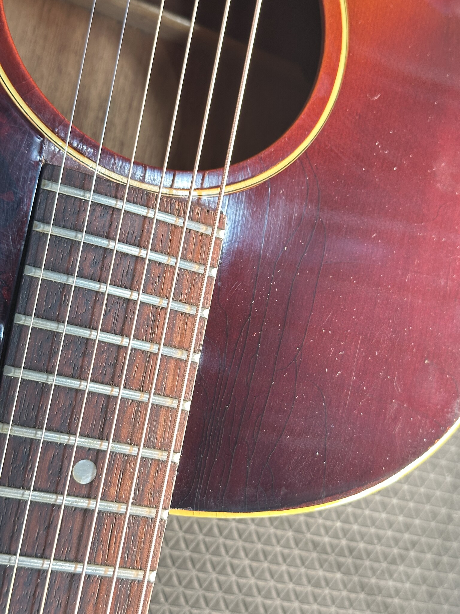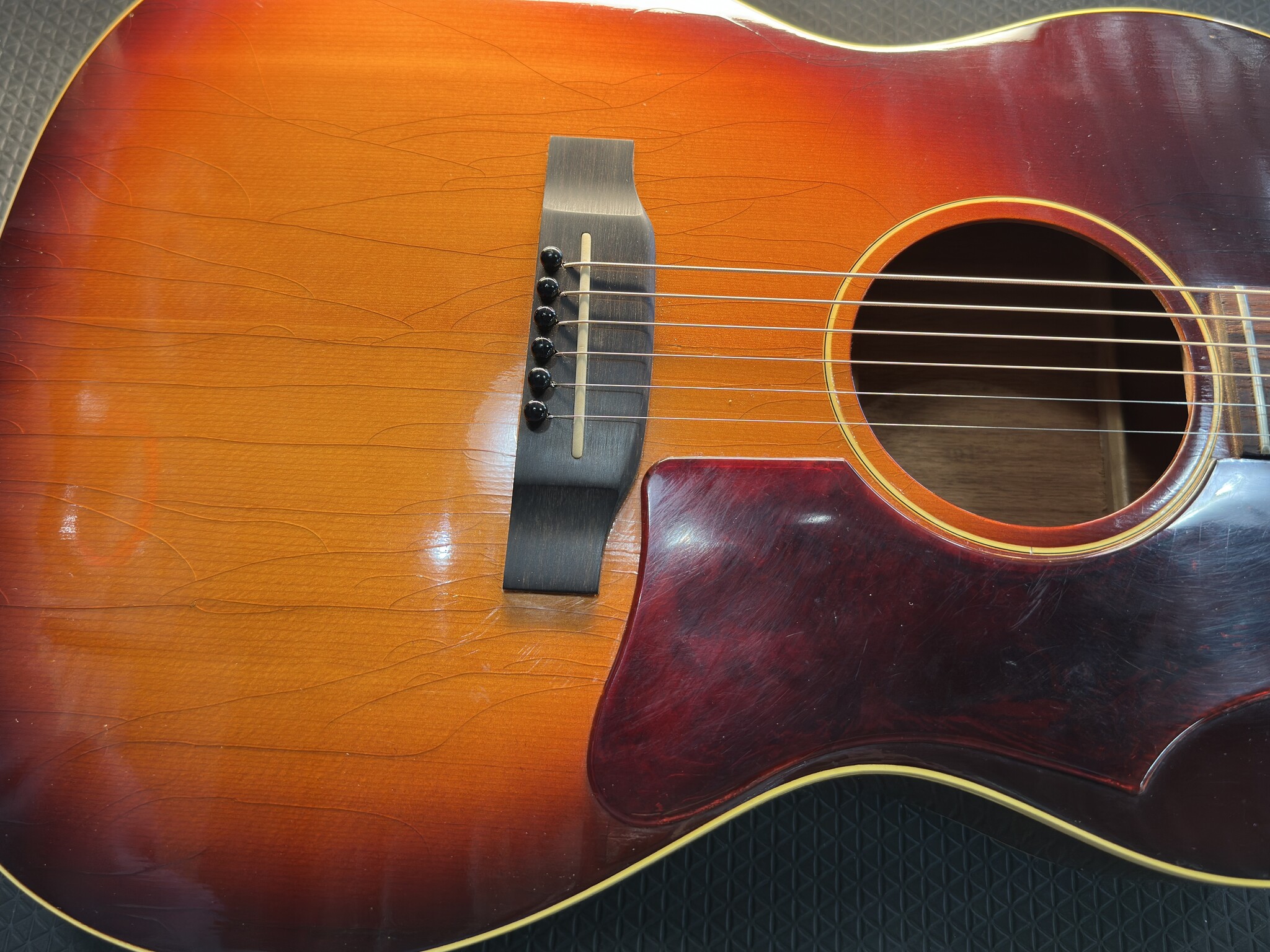 This guitar features ladder bracing, Mahogany Back & Sides and a Spruce Top. The Bridge and Fingerboard are Rosewood. The frets appear to be original but could have been leveled at some point as they are very clean. Original Nut. The Sun-burst top has plenty of character in the form of checking. Tastefully reminding the audience that this guitar has been around the block! The saddle is low but with just enough break angle. The guitar could benefit from a neck reset but is very playable as is.