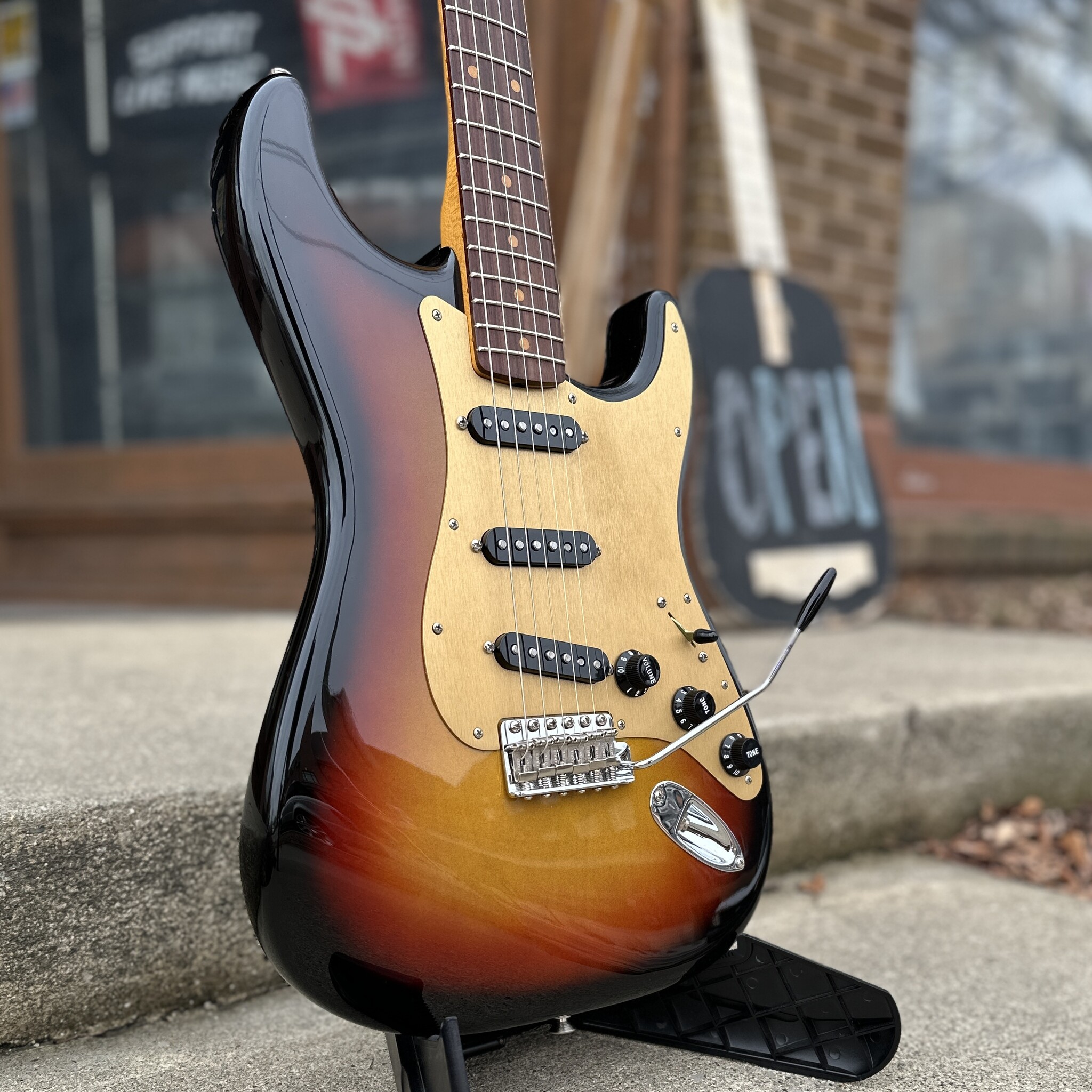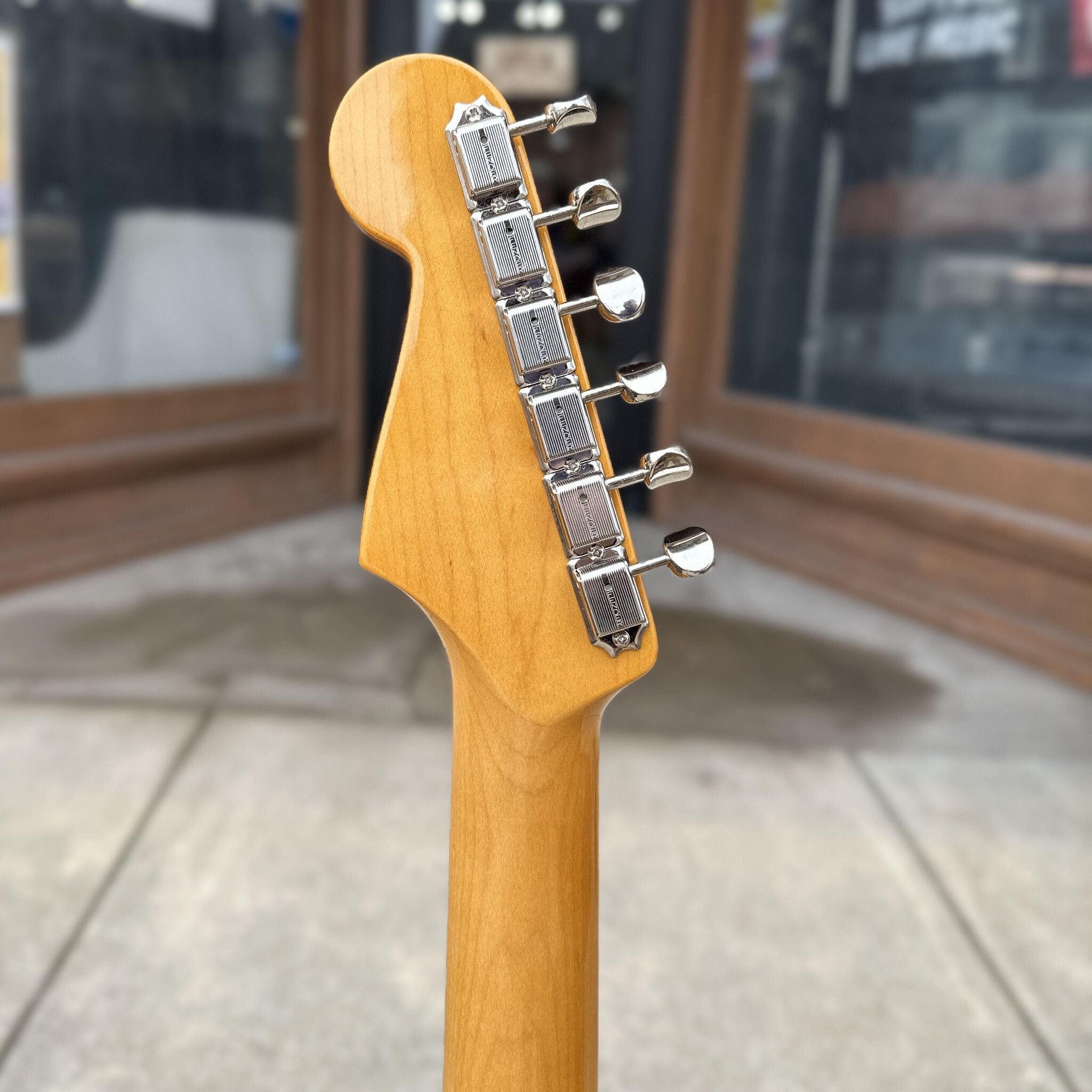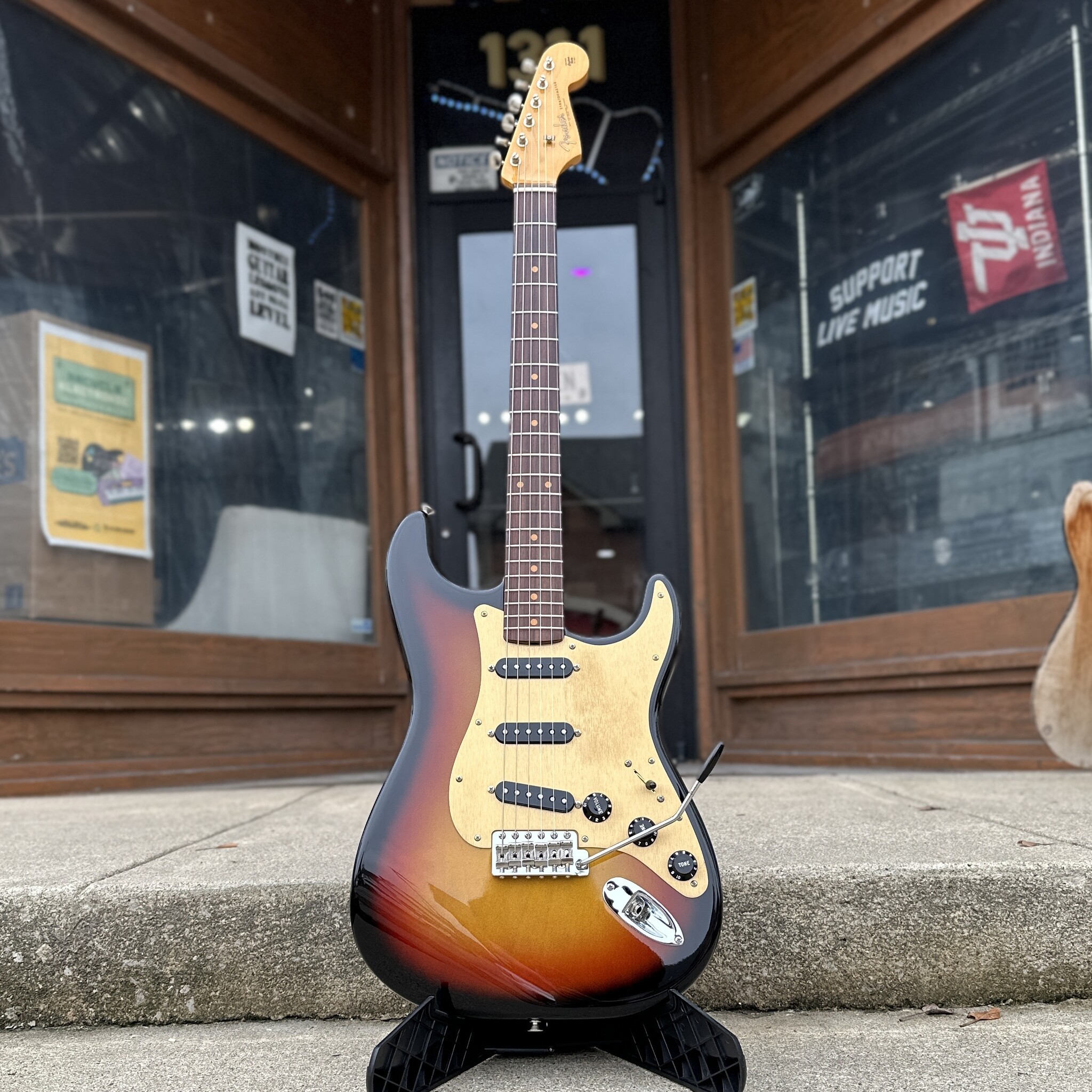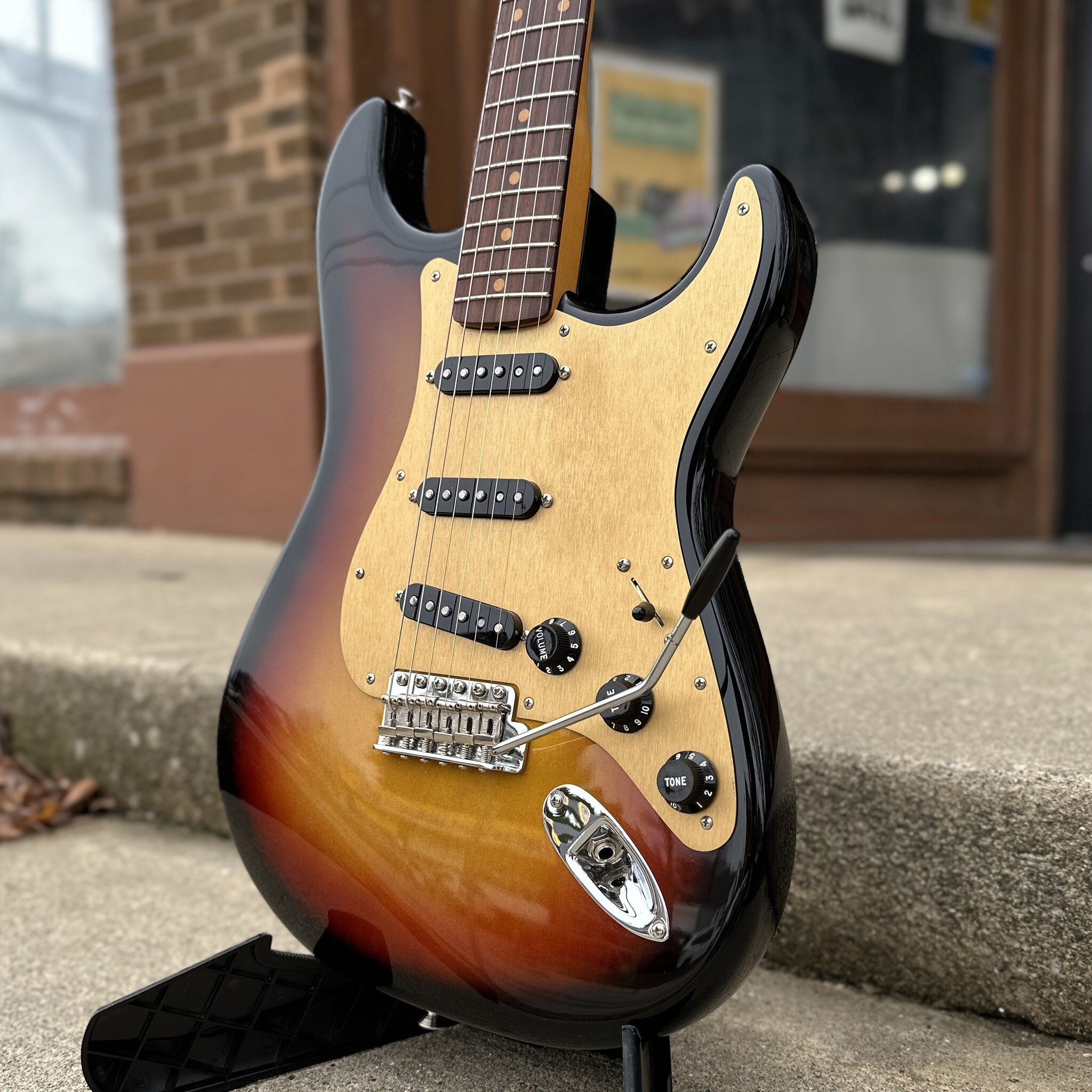 During the late '50s and early '60s, the popularity of Fender musical instruments flourished, and although the Fender assortment had expanded to include many great new instruments, the Stratocaster® reigned supreme. By 1961, the Stratocaster had taken on a more refined aesthetic, with a 3-Color Sunburst reformulated with a more vibrant red and bolder black edge, topped with a 3-ply pickguard accenting the Strat's signature curves.