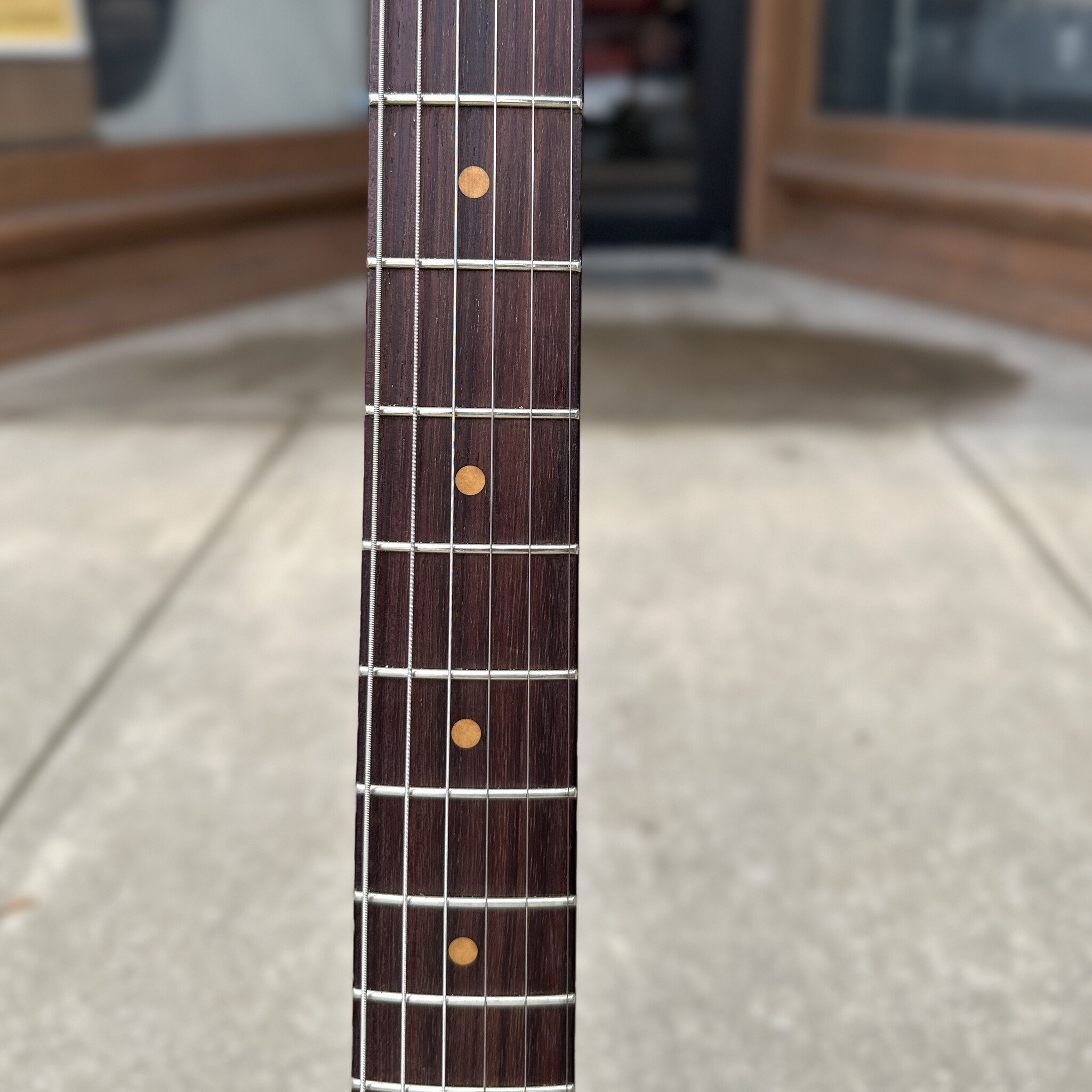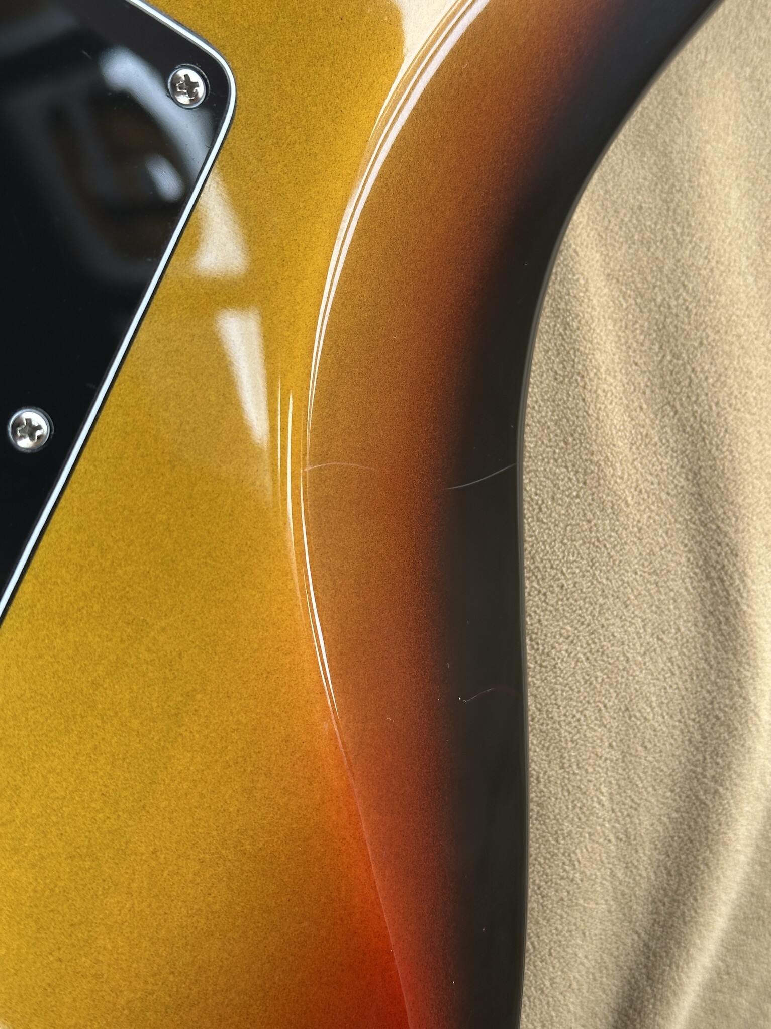 This guitar is is excellent condition! It has had the pickguard and pickup covers and knobs replaced, but as pictured the originals are in the case! There is some light swirling, and 2 scratches on the inside top bevel, pictured.