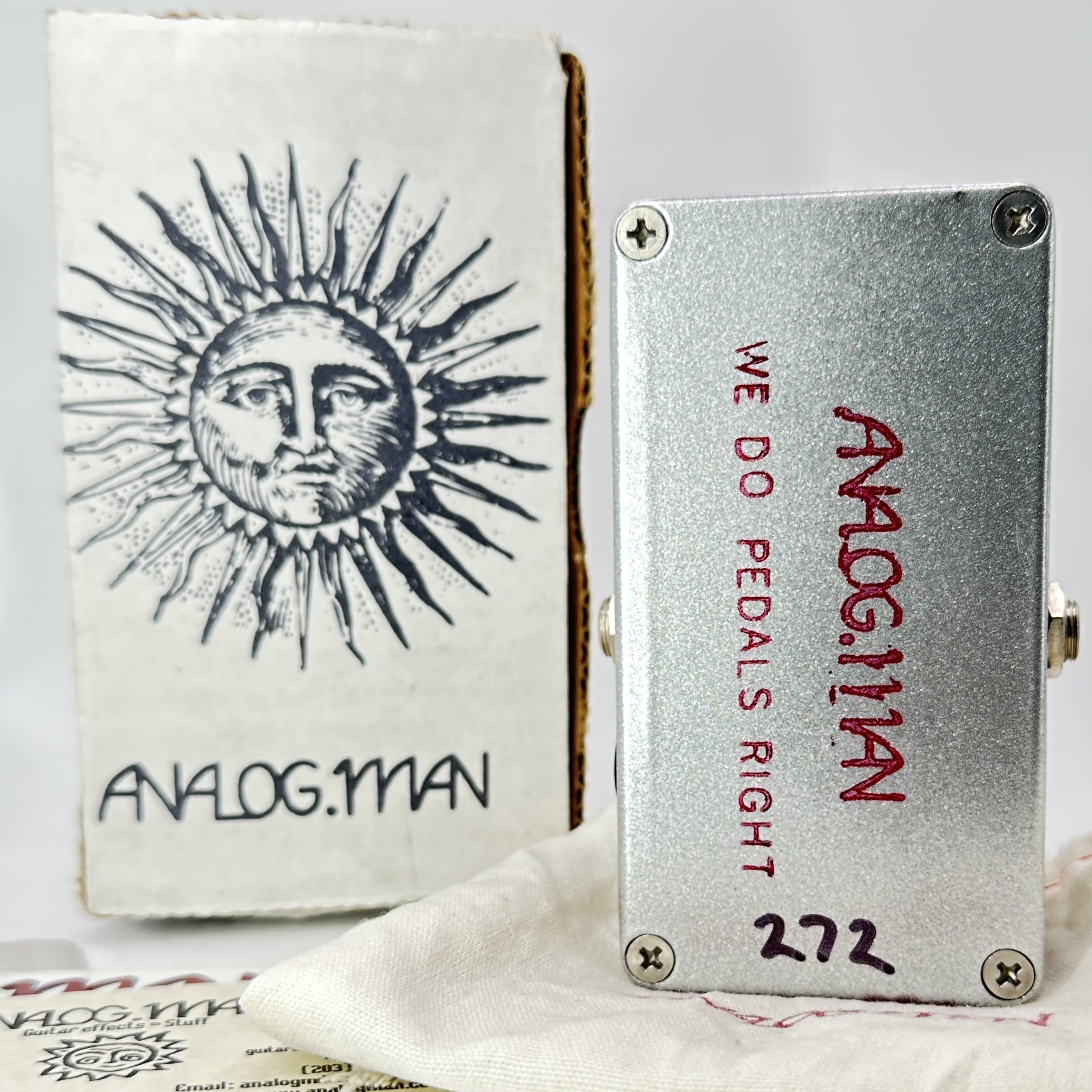In 2010 Analog Man started making this pedal ourselves. They have been available with hand stamped graphics like our switch boxes until late 2013 when we came up with nice graphics like the original, but in heavy duty epoxy ink instead of a fragile sticker. In June of 2017, we made the logo full color, adding red like Robbie's original!