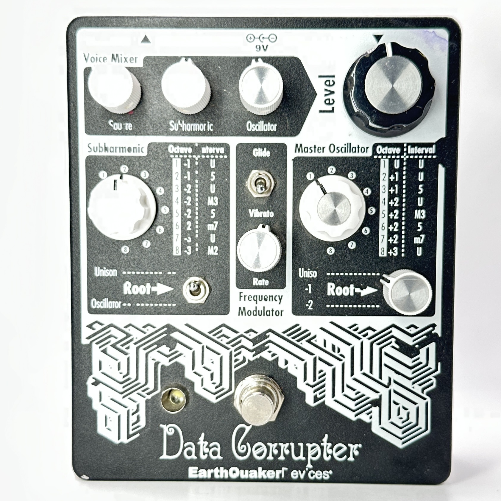 The Master Oscillator is the central nervous system at the heart of the Data Corrupter’s cyberpunk hive mind. It feeds your input to the signal harvester in its original octave (Unison), one octave down (-1) or two octaves down (-2) for maximum compatibility with your preferred instrument and frequency register. Once you’ve chosen your input octave, then the Data Corrupter will perform its calculations and spit out an analog synthesized frequency, which can be pitch-bent for portamento or vibrato sounds by the Frequency Modulator! From there, you can blend in one of eight Subharmonic intervals up to three octaves below the input and mix in a square wave fuzz tone for maximum data corruption.
