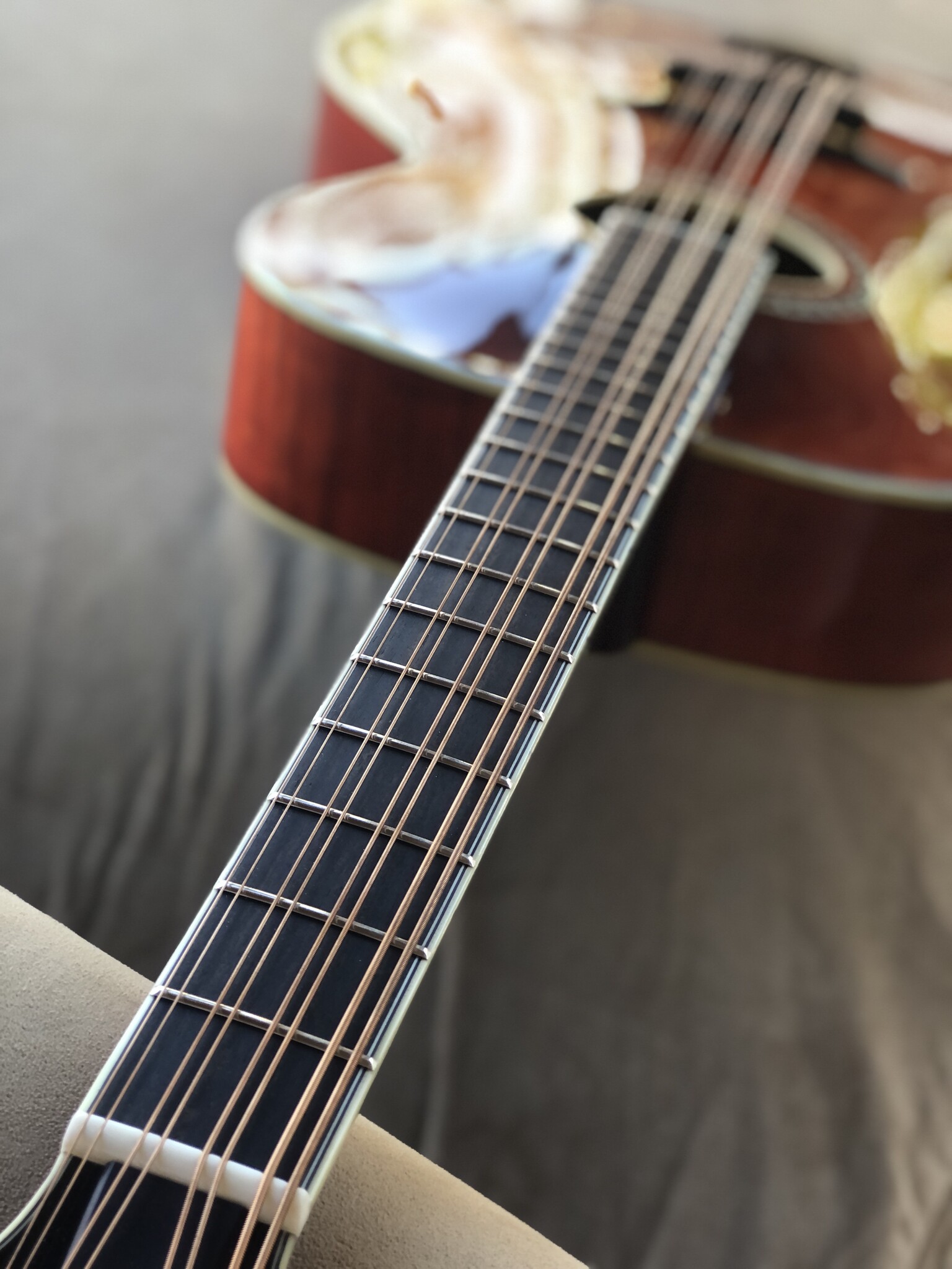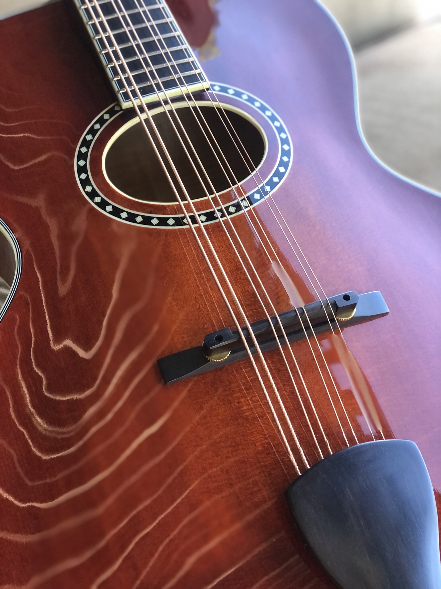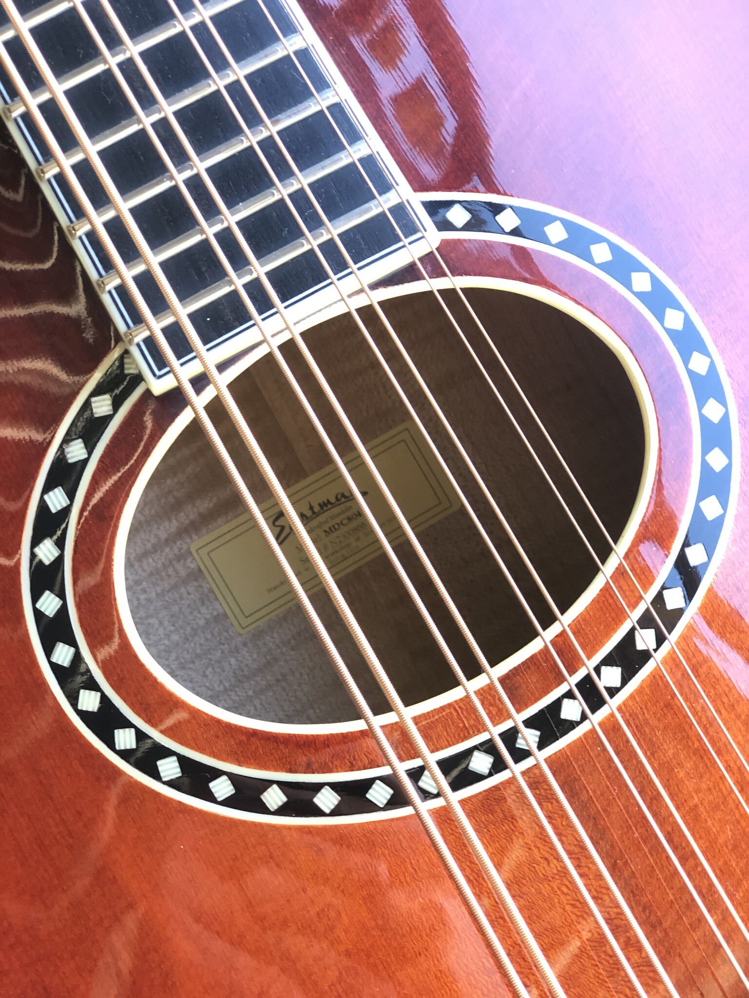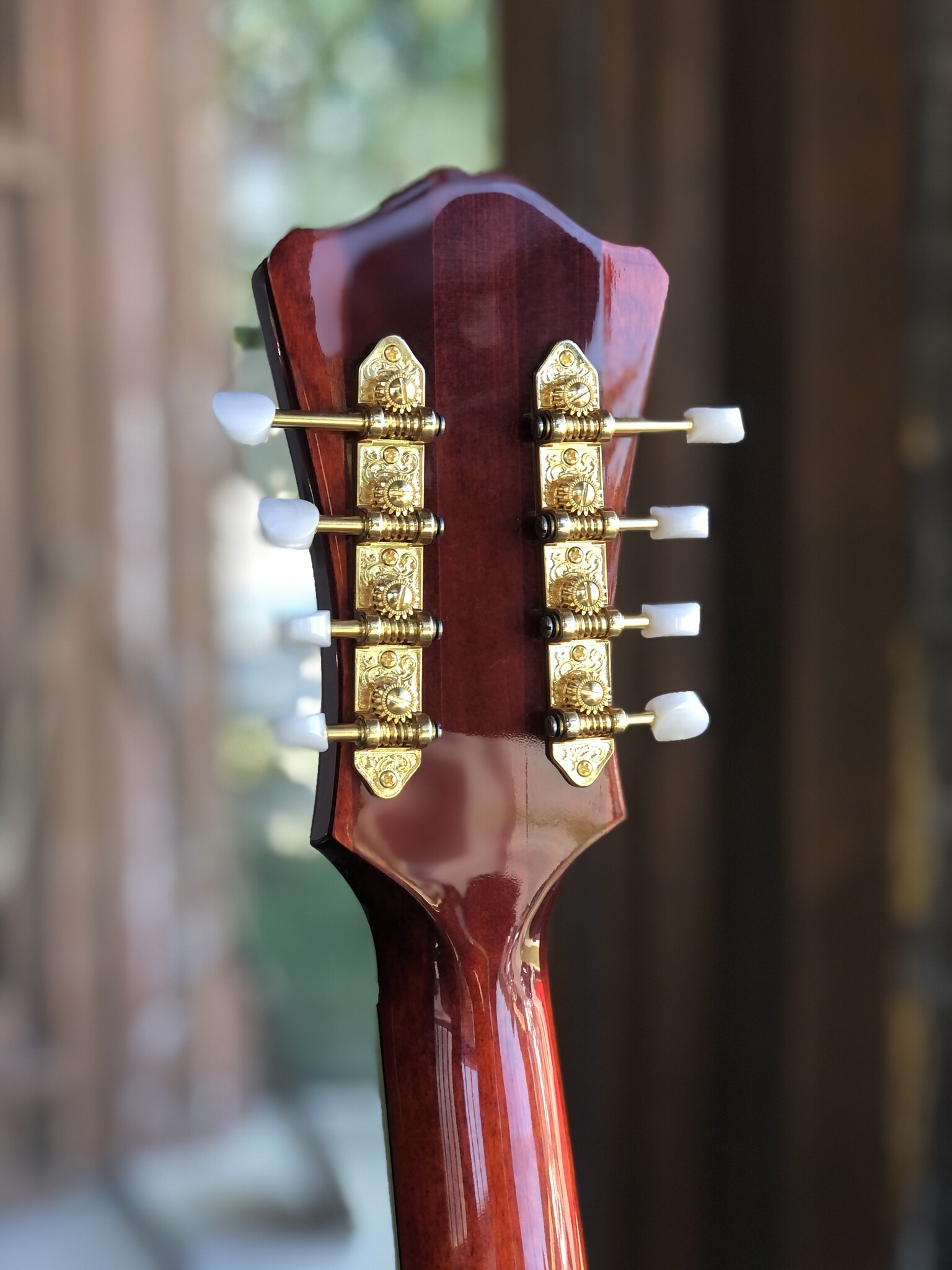 The maple neck is paired with an ebony fingerboard, boasting a 12" radius and 22 Jescar FW47104 frets. The instrument's scale length of 25" and setup with D'Addario J78 strings deliver a rich, resonant tone. The abalone headstock logo and gold hardware add a luxurious touch, while the adjustable ebony bridge and Gotoh MF40R-MP tuners ensure precise tuning stability.
