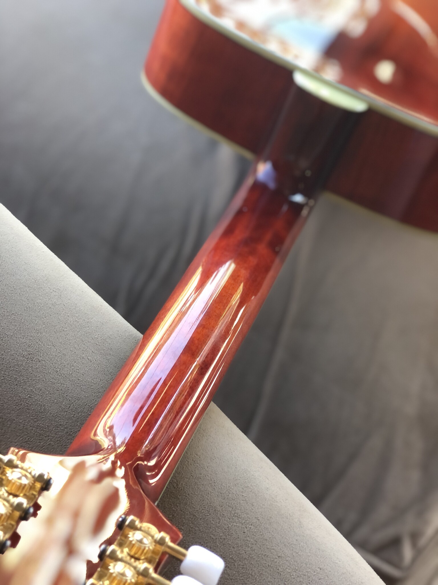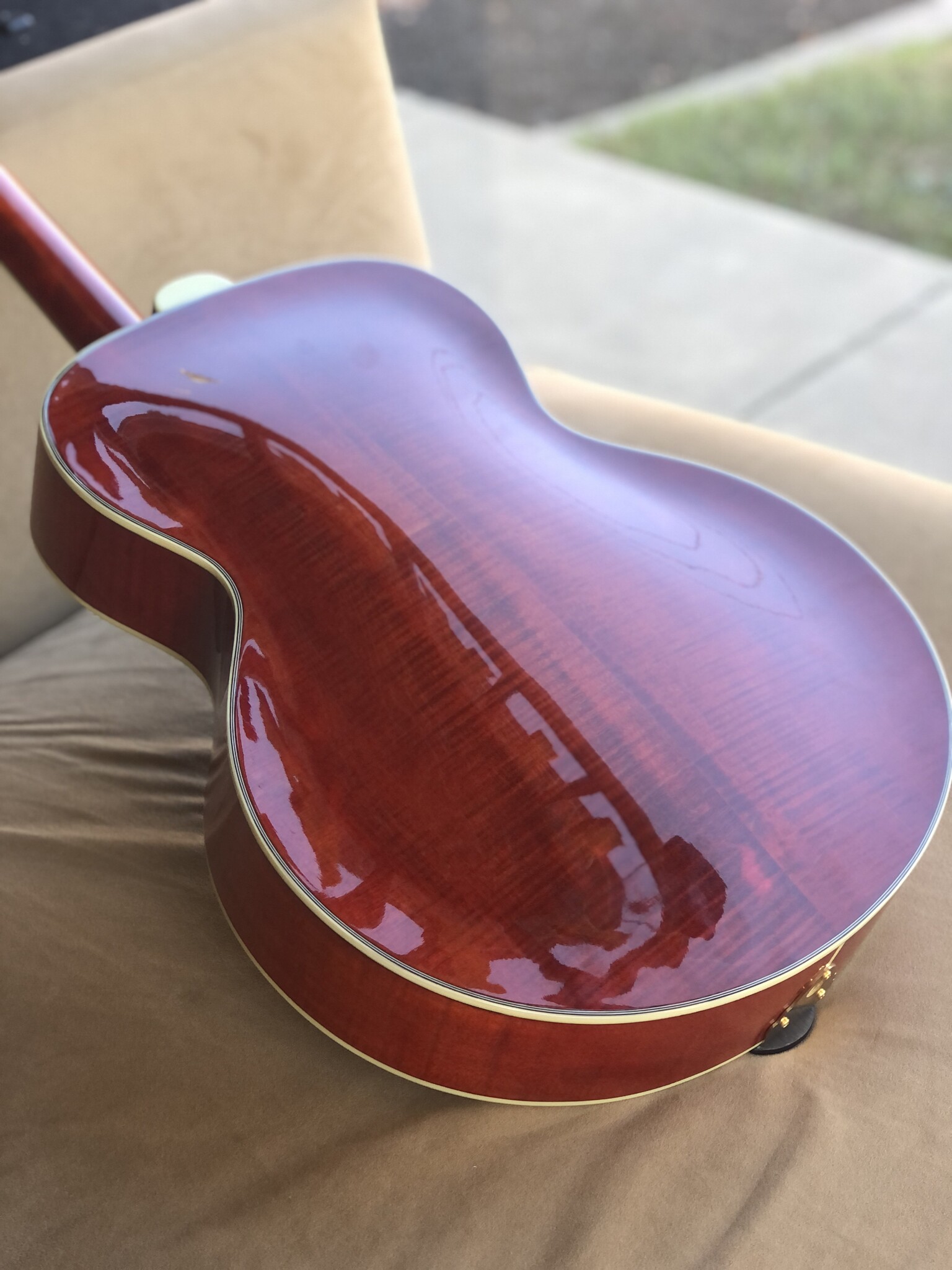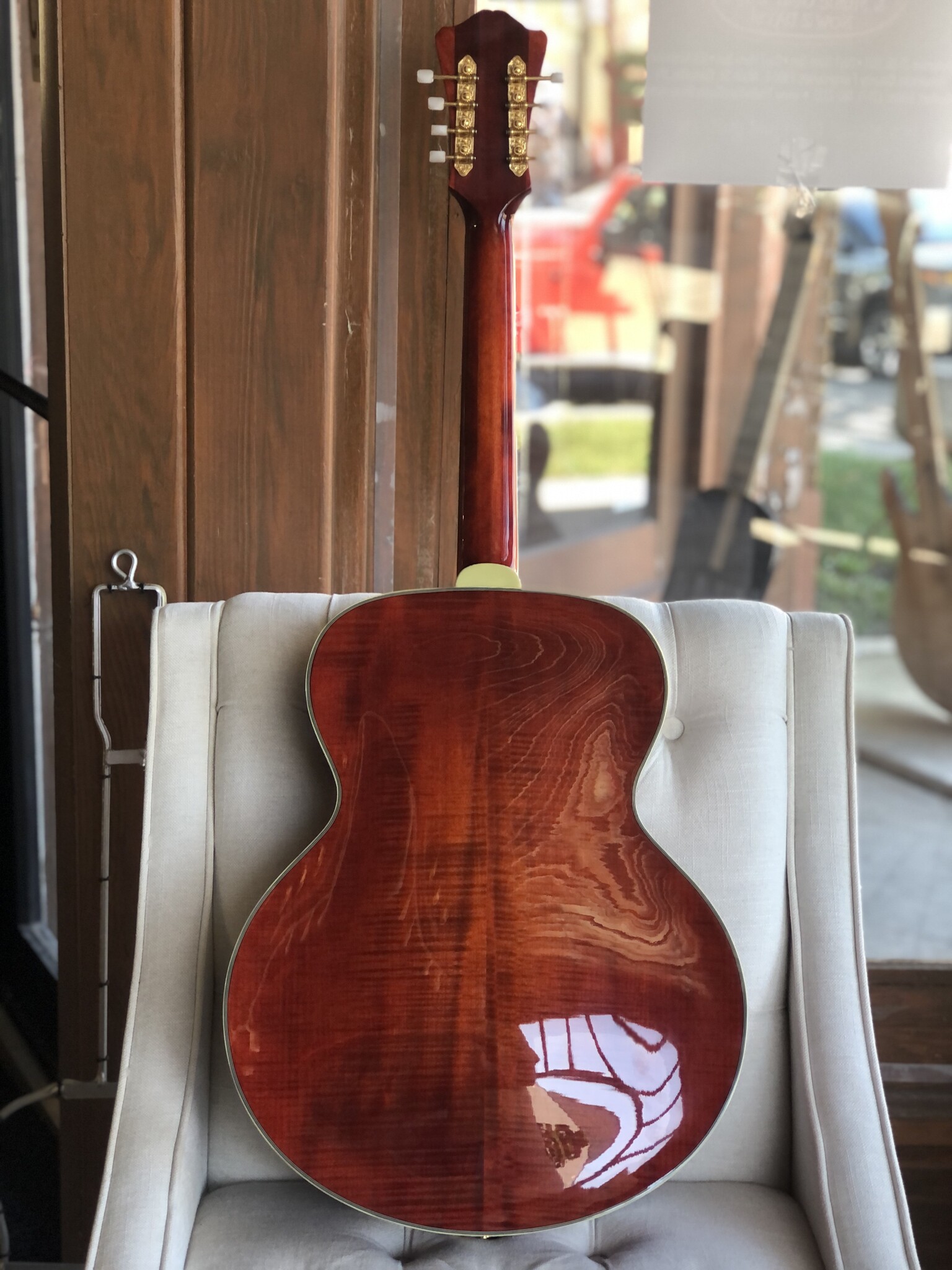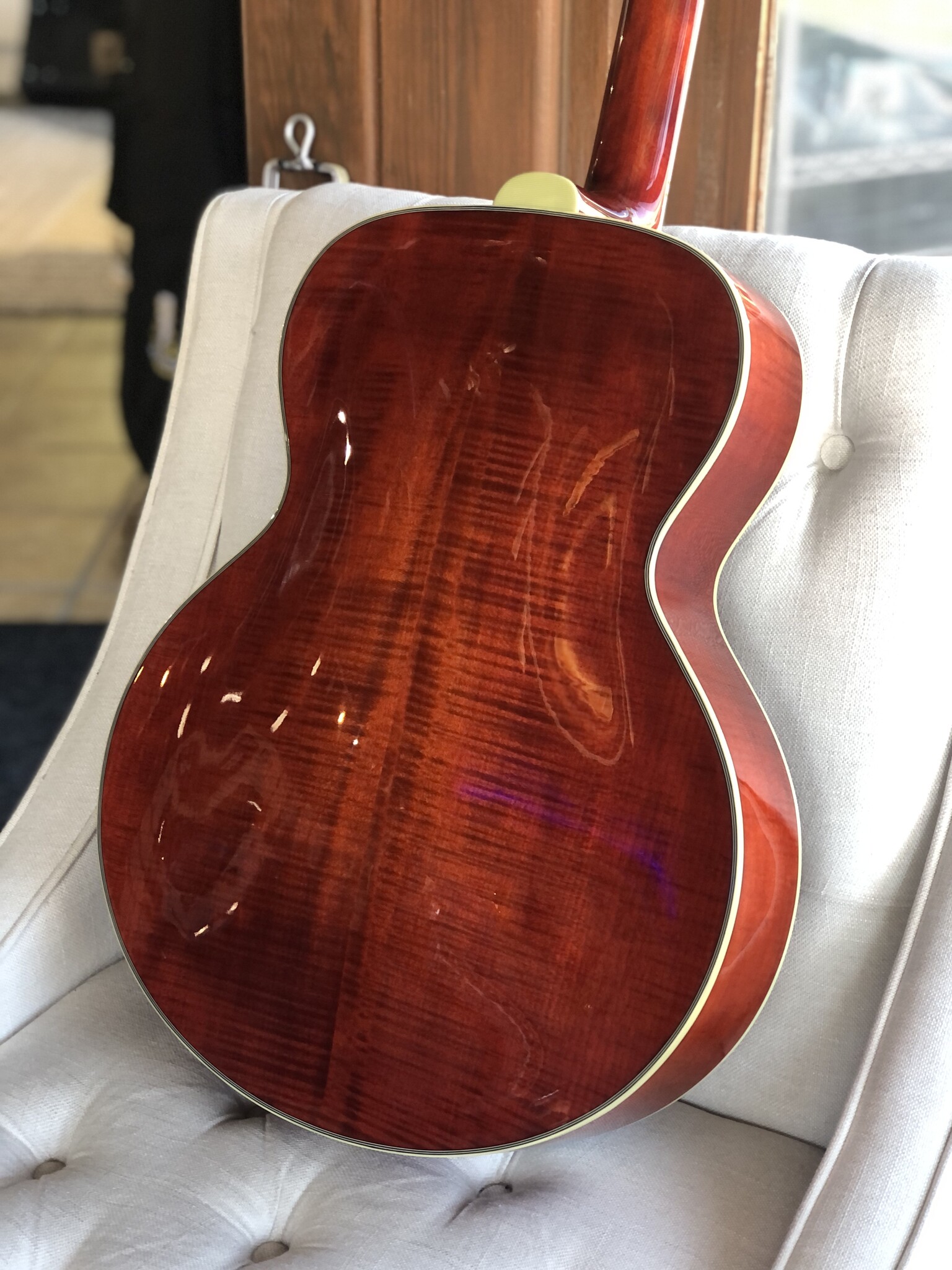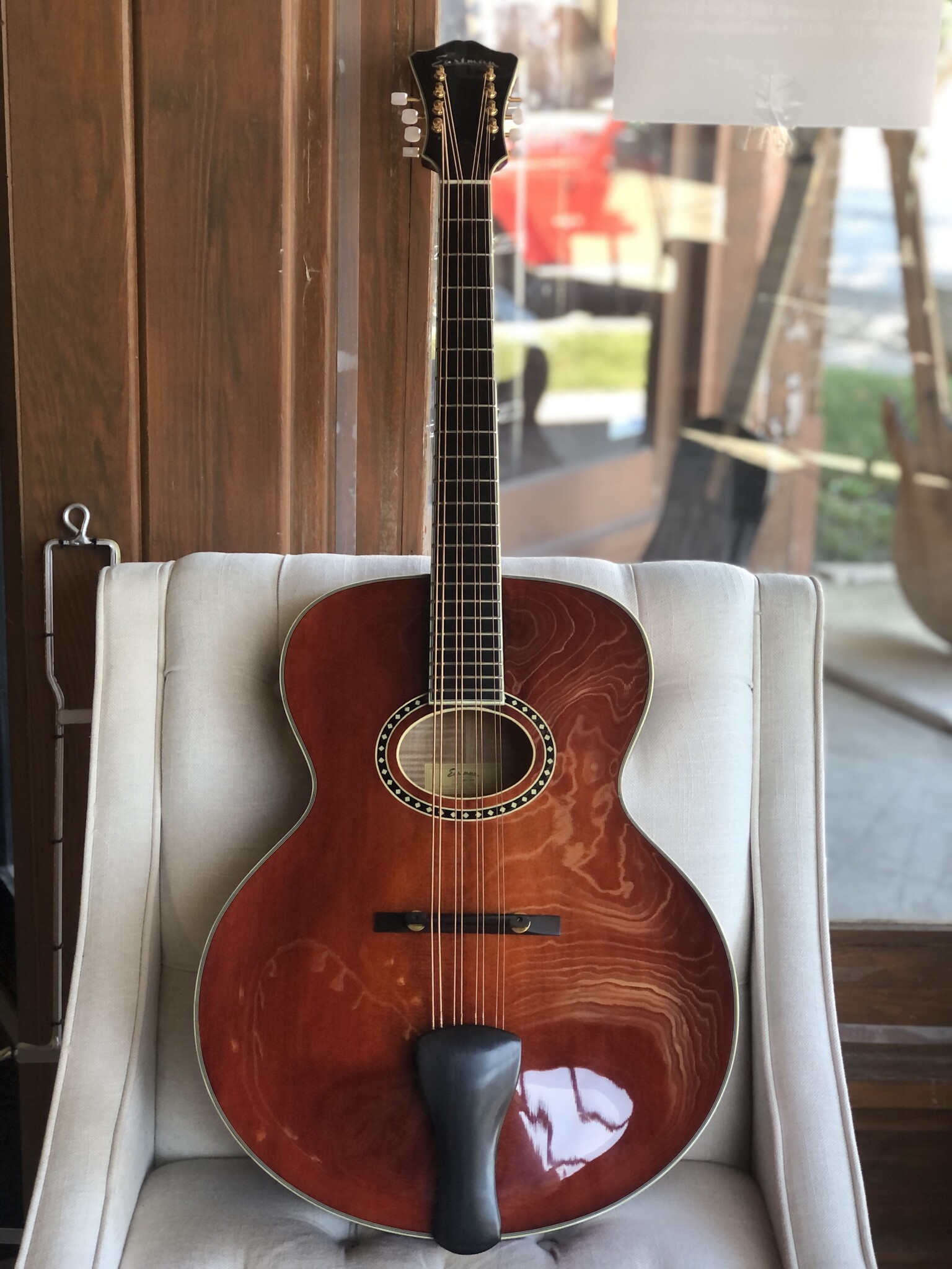 The maple neck is paired with an ebony fingerboard, boasting a 12" radius and 22 Jescar FW47104 frets. The instrument's scale length of 25" and setup with D'Addario J78 strings deliver a rich, resonant tone. The abalone headstock logo and gold hardware add a luxurious touch, while the adjustable ebony bridge and Gotoh MF40R-MP tuners ensure precise tuning stability.