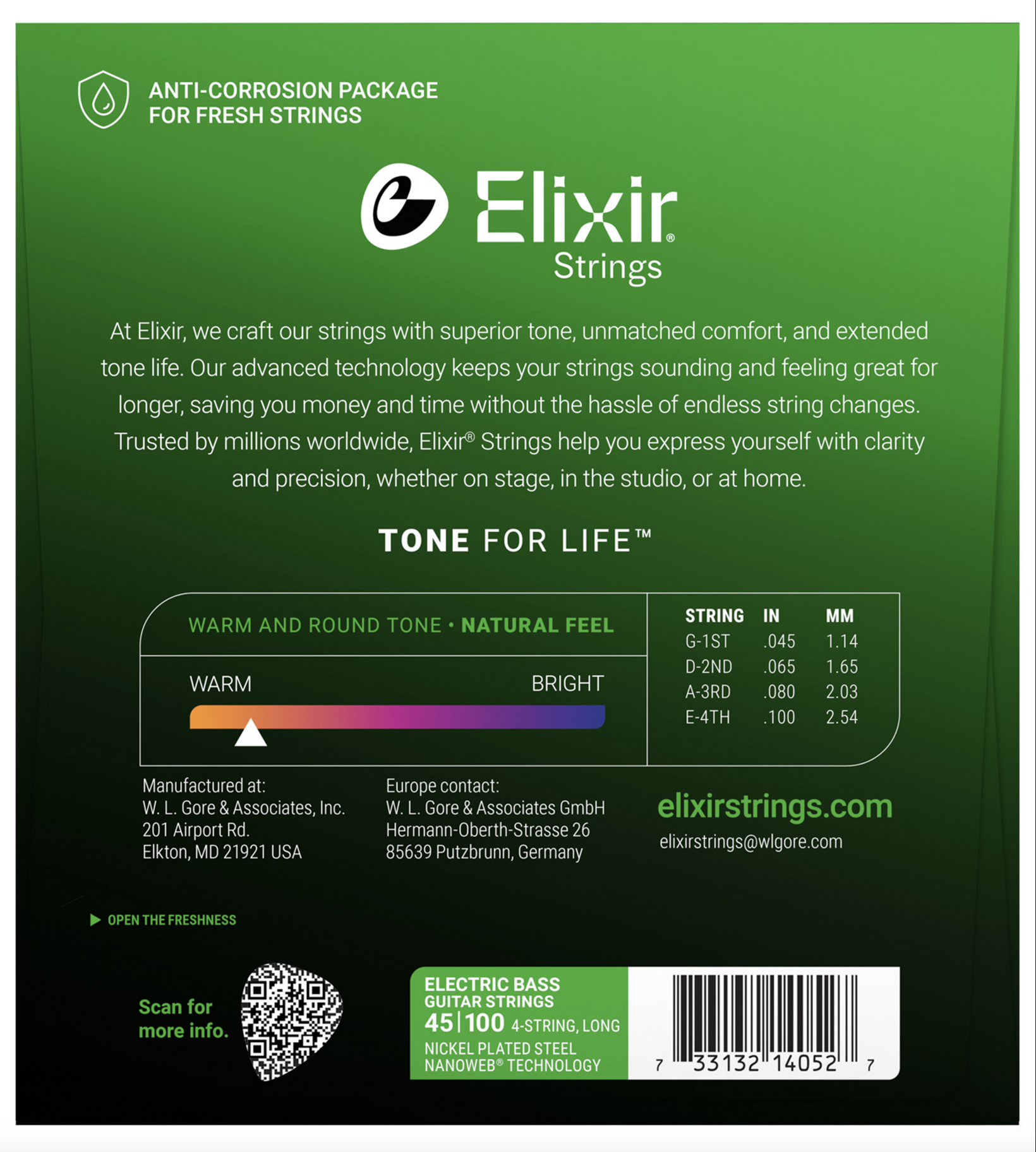 LIGHT 45-100 ELECTRIC BASS STRINGS WITH ELIXIR® TECHNOLOGY FOR LONGEST-LASTING TONE