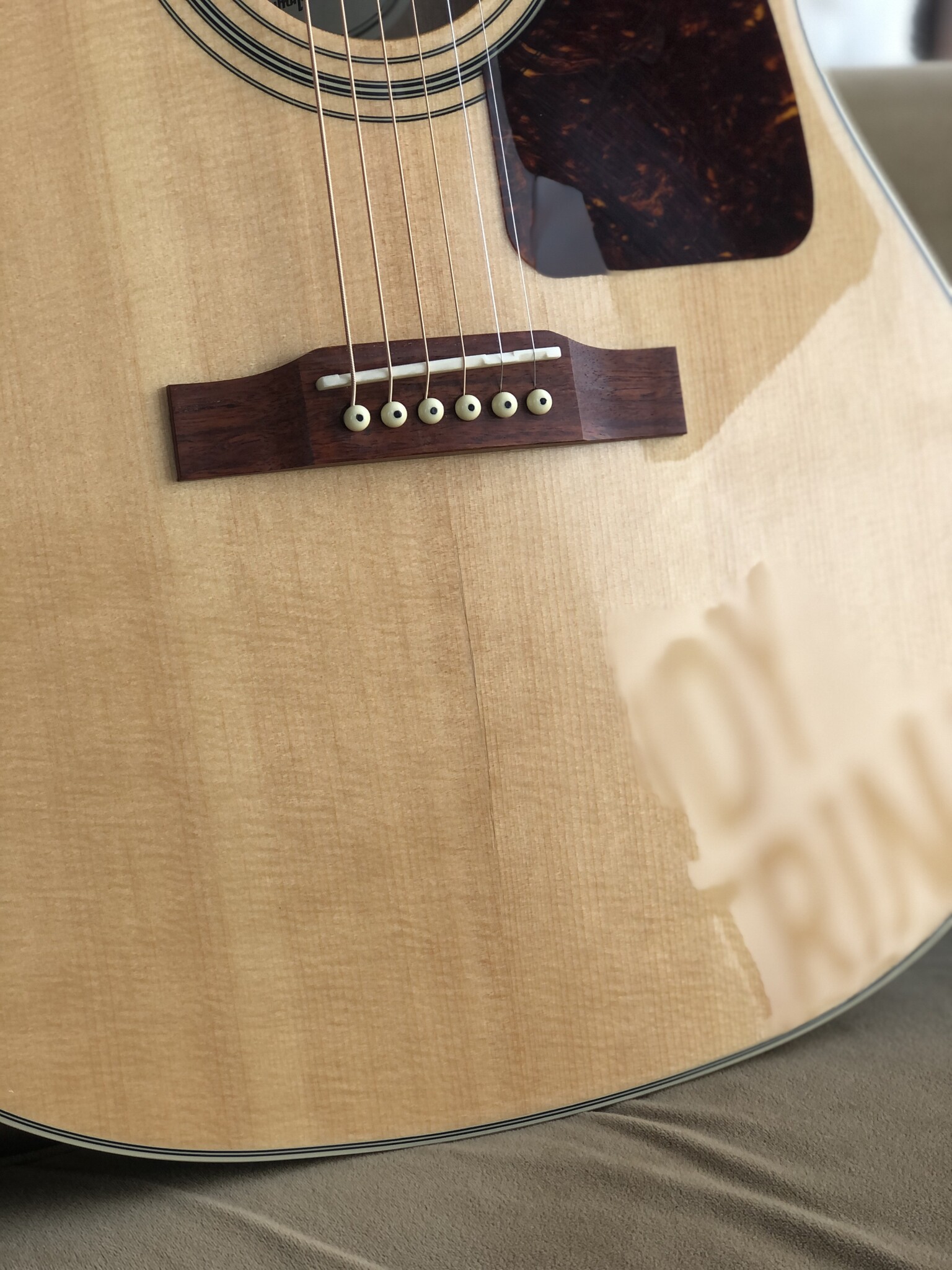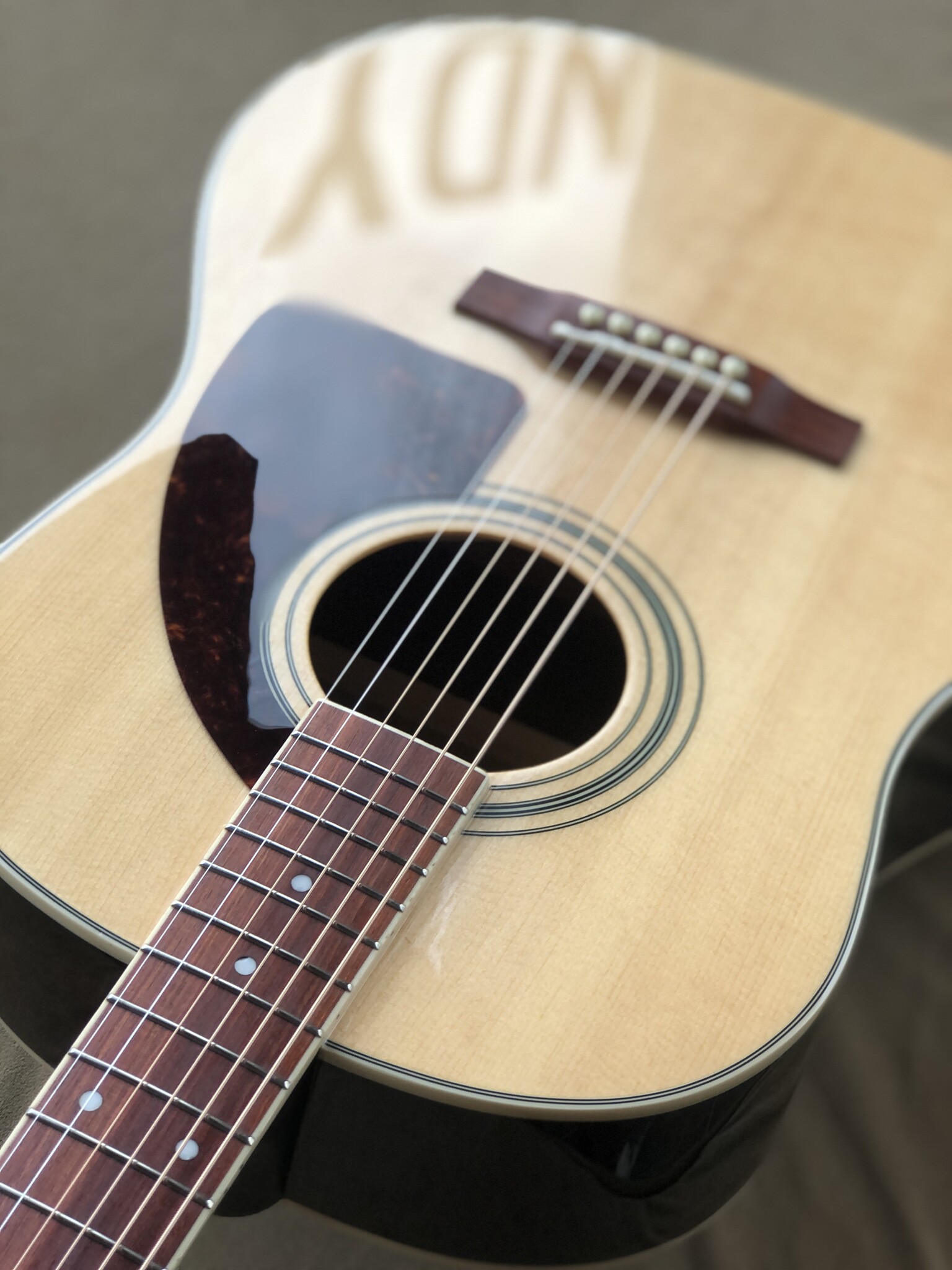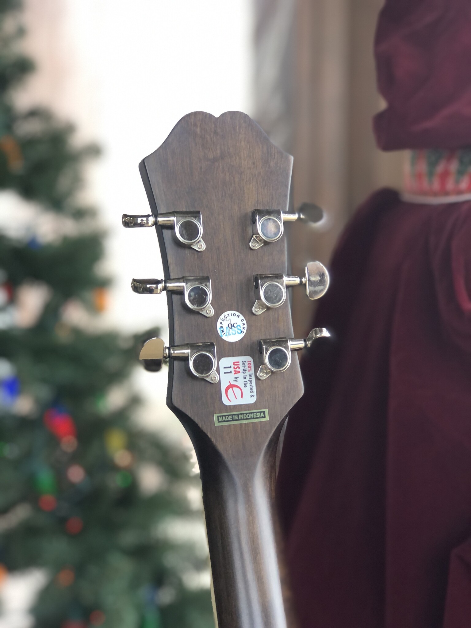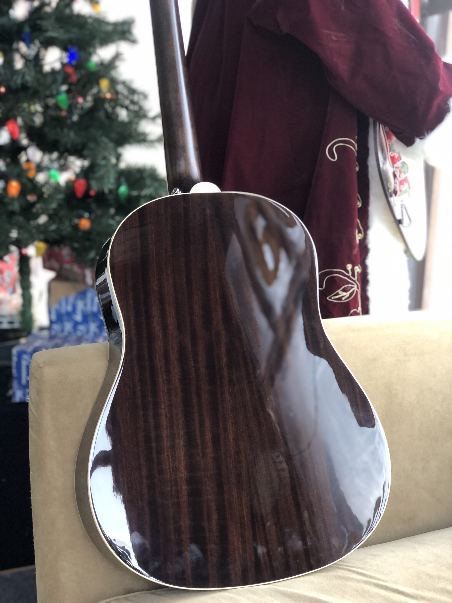 This guitar is used but in good shape, some light picking marks are visible on the pickguard. A center seem crack has been repaired. This guitar weighs in at 4.7lbs and does not include a case or gigbag. Here's more specs and information:
