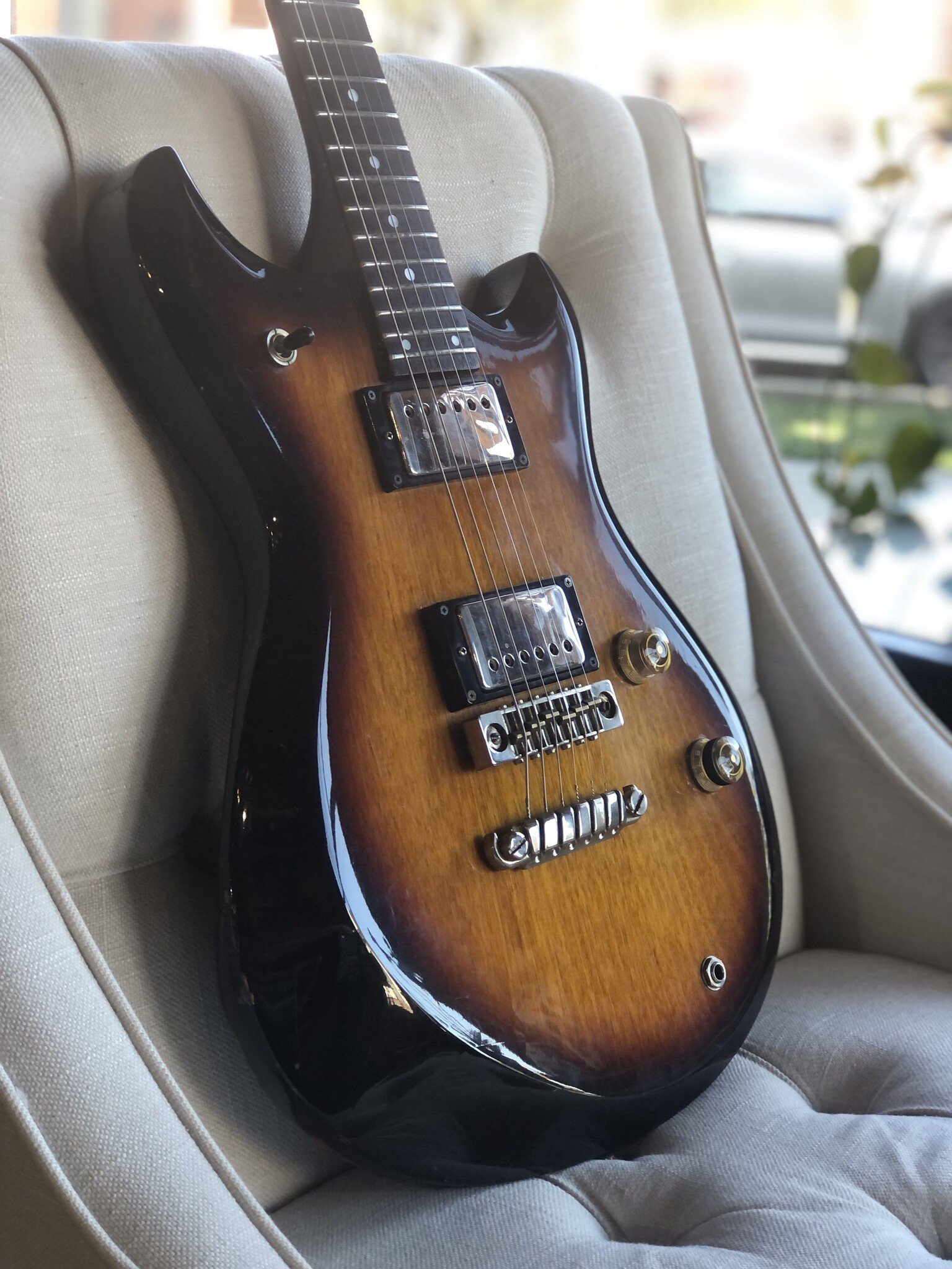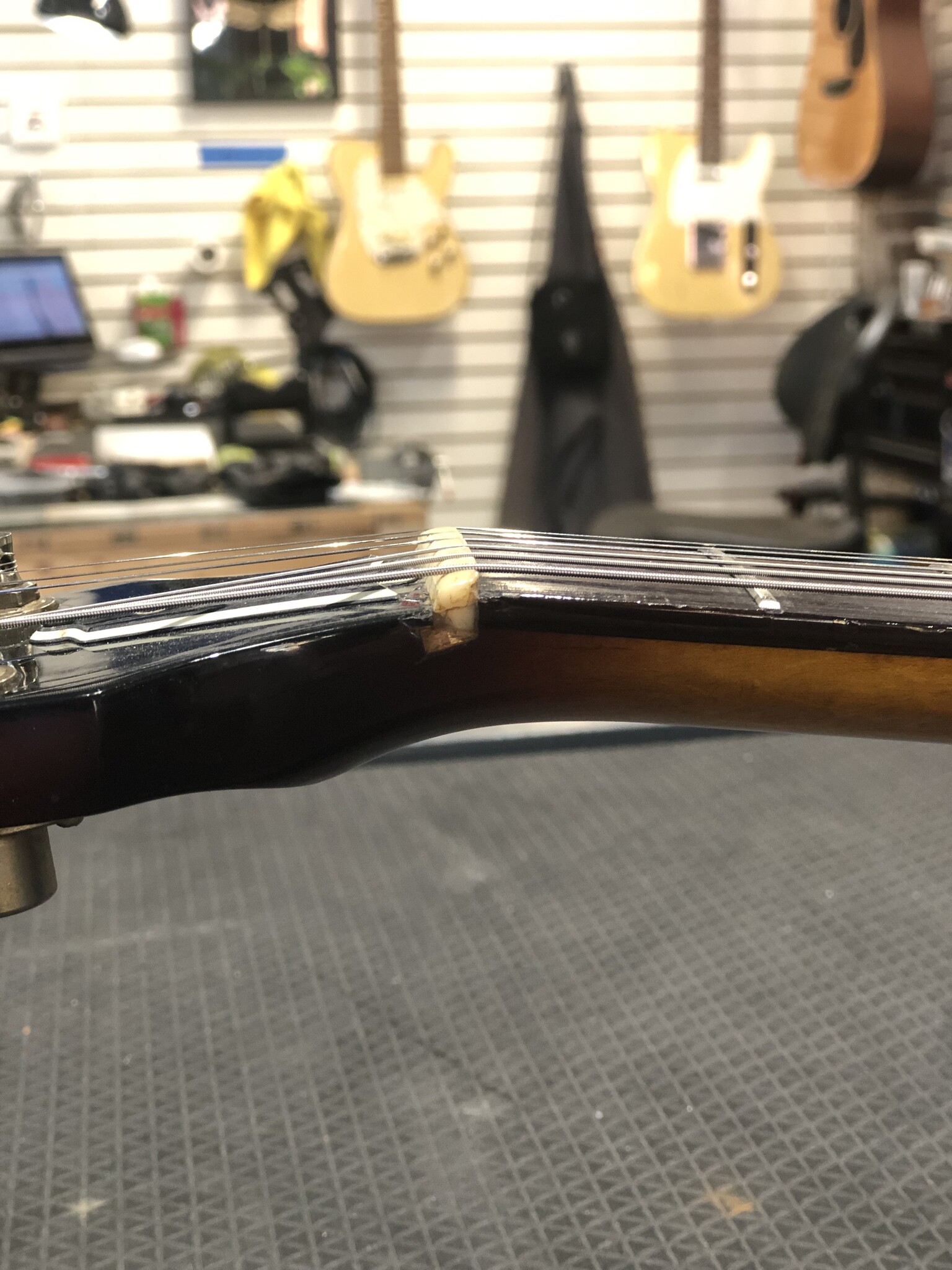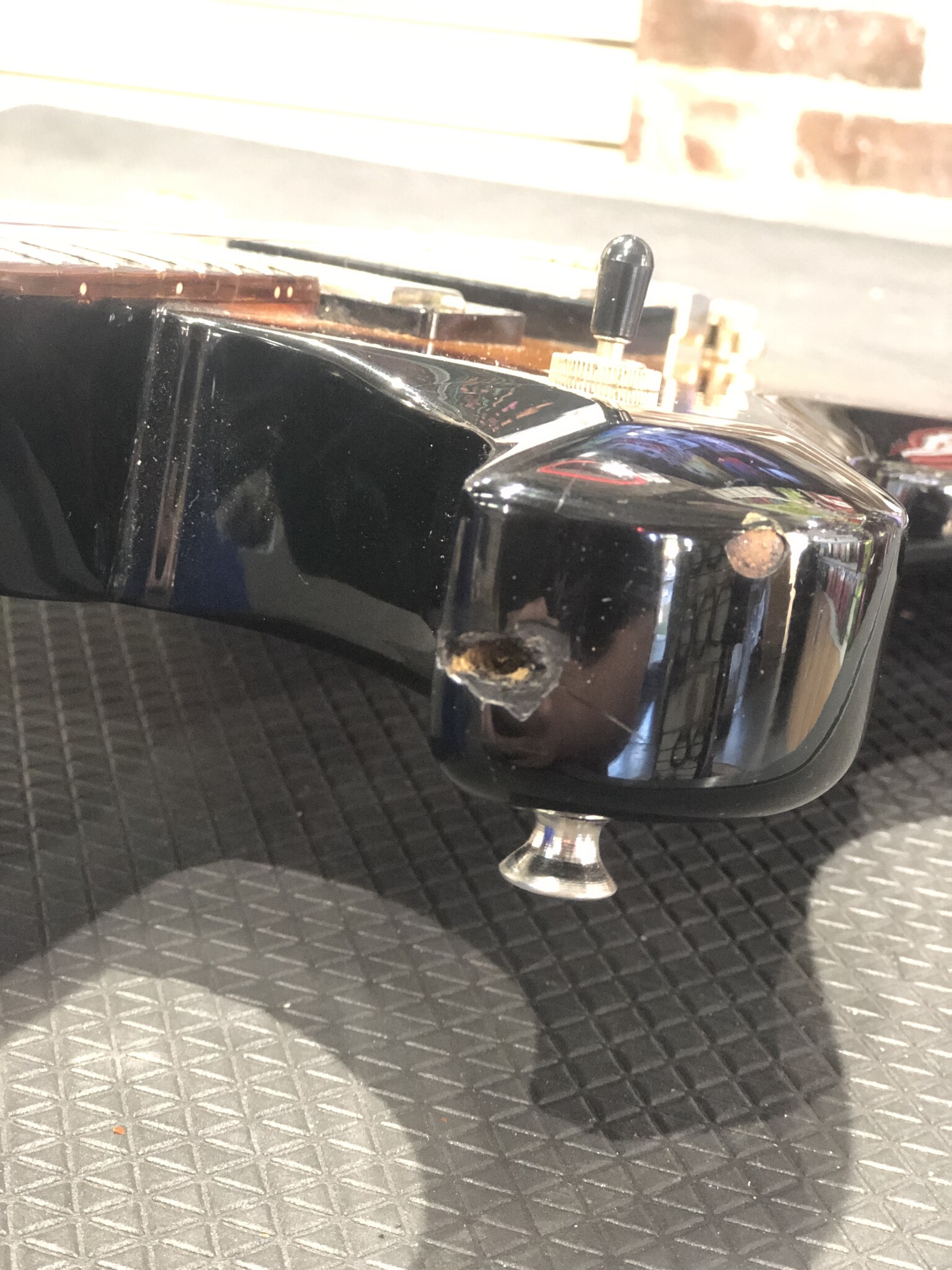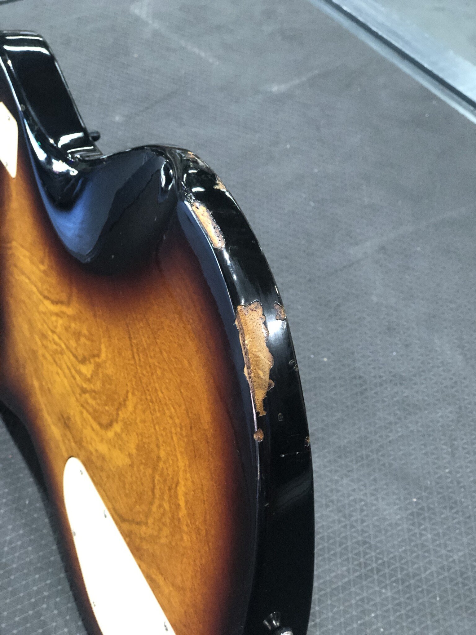 This guitar is heavily used and features a lot of wear. Finish marks and dings are present in the top and back. Large pieces of the finish are missing on the outside edge of the body. The strap button looks to be moved and a hole is visible in it's original location. The serial looks to have been chiselled as well. This guitar does not include a case and weighs in at 7.8lbs.
