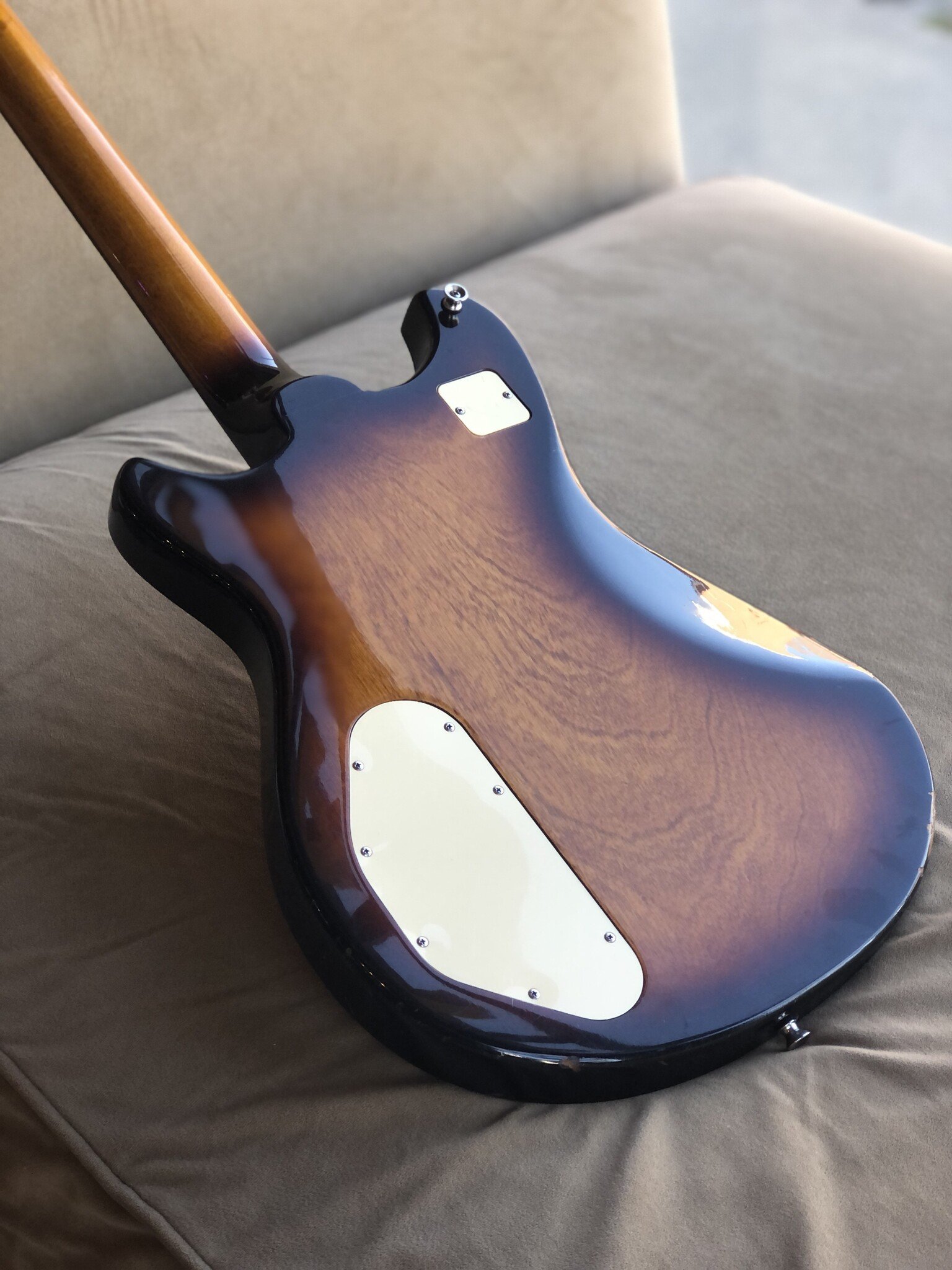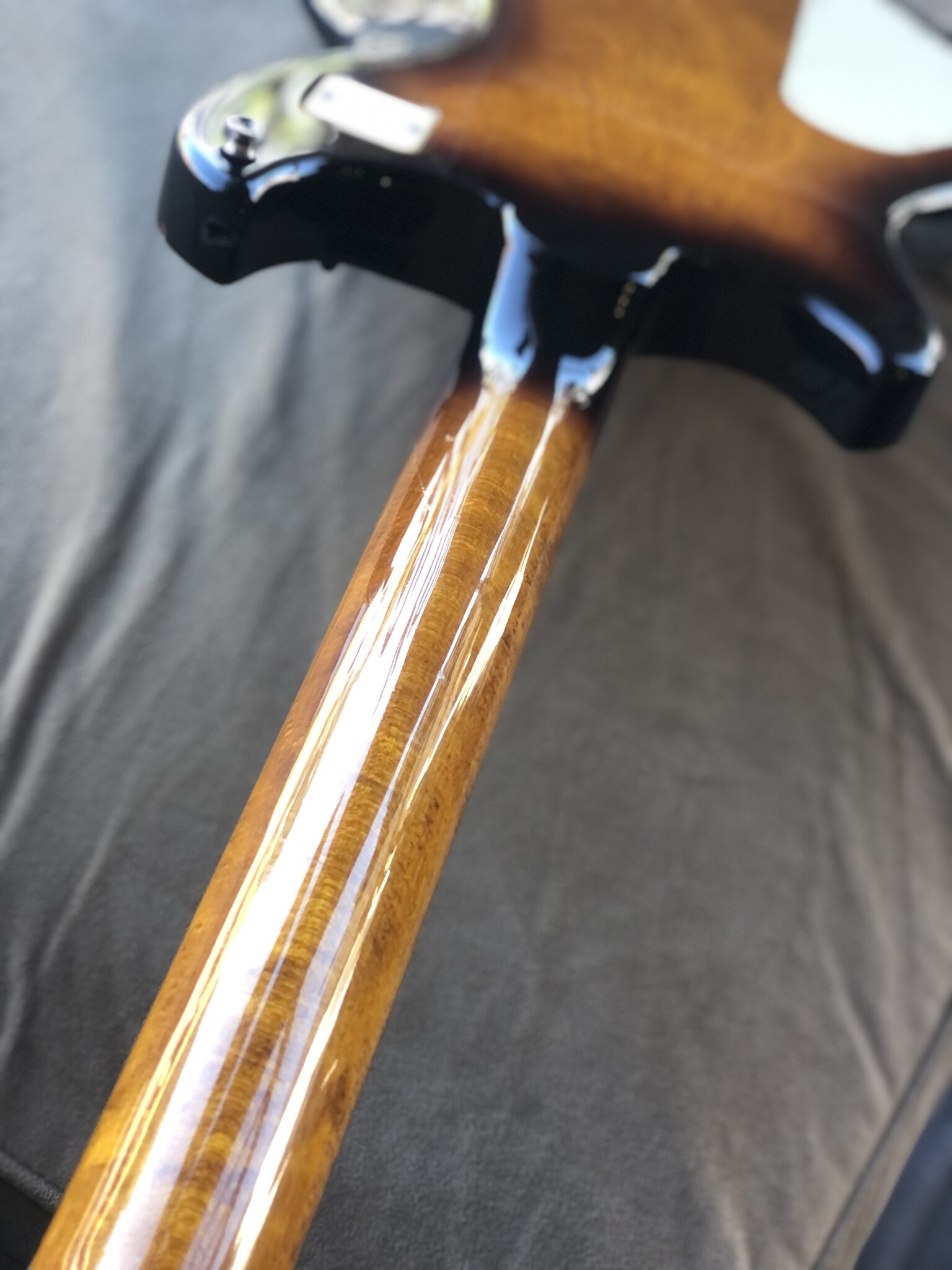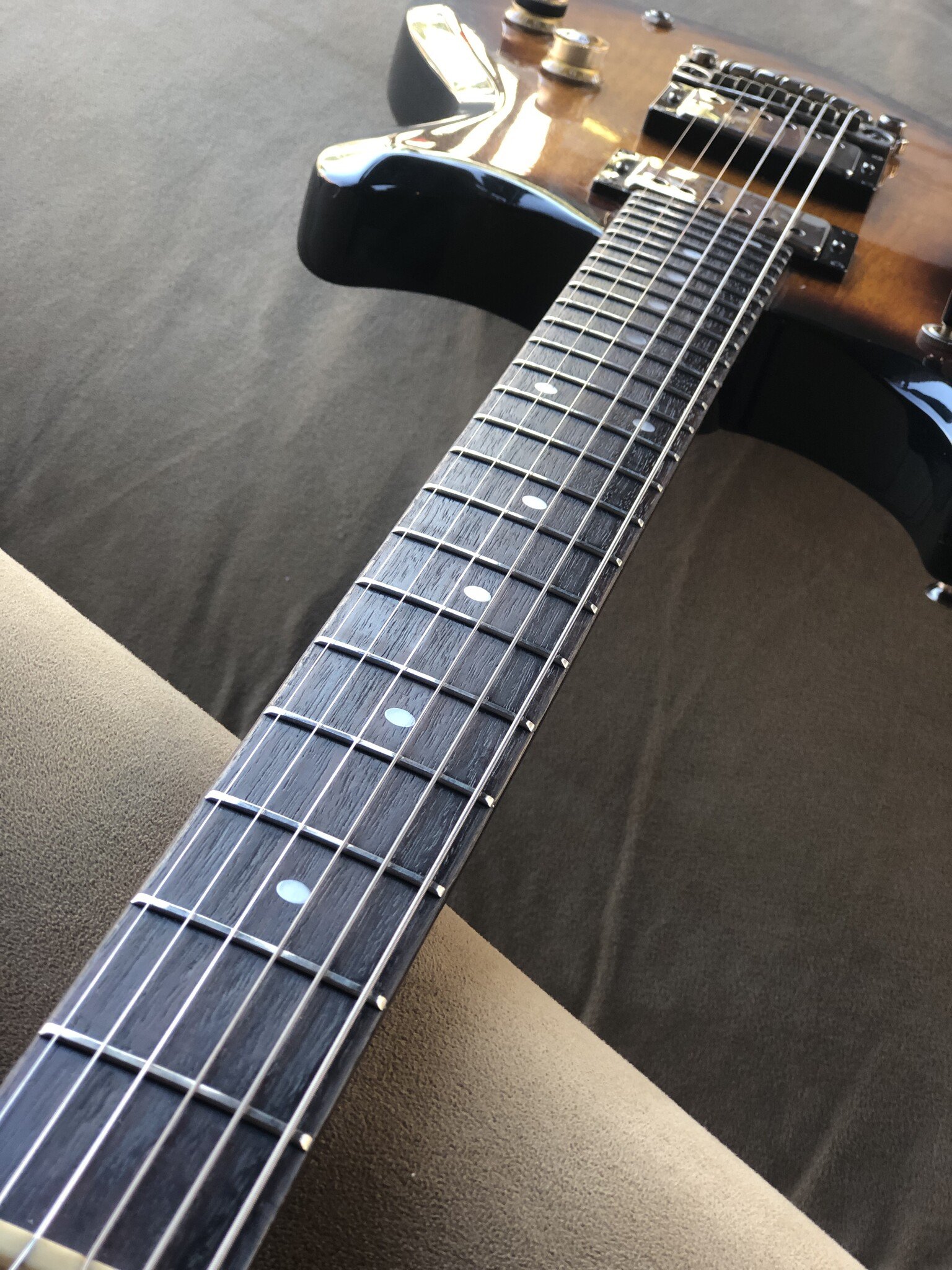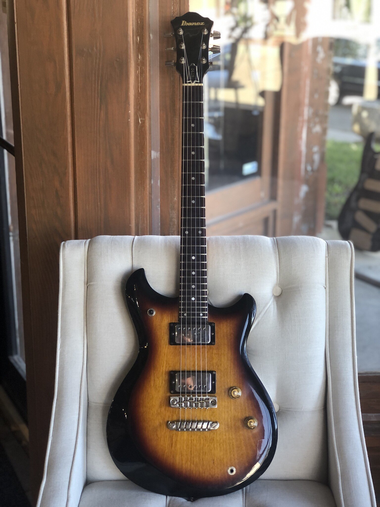 This guitar is heavily used and features a lot of wear. Finish marks and dings are present in the top and back. Large pieces of the finish are missing on the outside edge of the body. The strap button looks to be moved and a hole is visible in it's original location. The serial looks to have been chiselled as well. This guitar does not include a case and weighs in at 7.8lbs.
