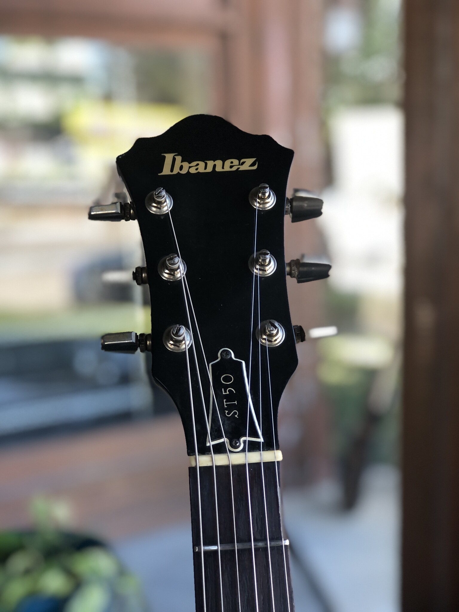 The ST50 features a laminated mahogany body mated to a set-in laminated maple neck with a 24-fret rosewood fingerboard with pearloid dot position markers. Components include a pair of Ibanez V2 humbucking pickups with exposed cream bobbins mounted in cream pickup rings, a Tune-o-matic style Gibraltar fixed bridge with Quik Change tailpiece and VelveTune II machine heads. The output is mounted on the face of the guitar.