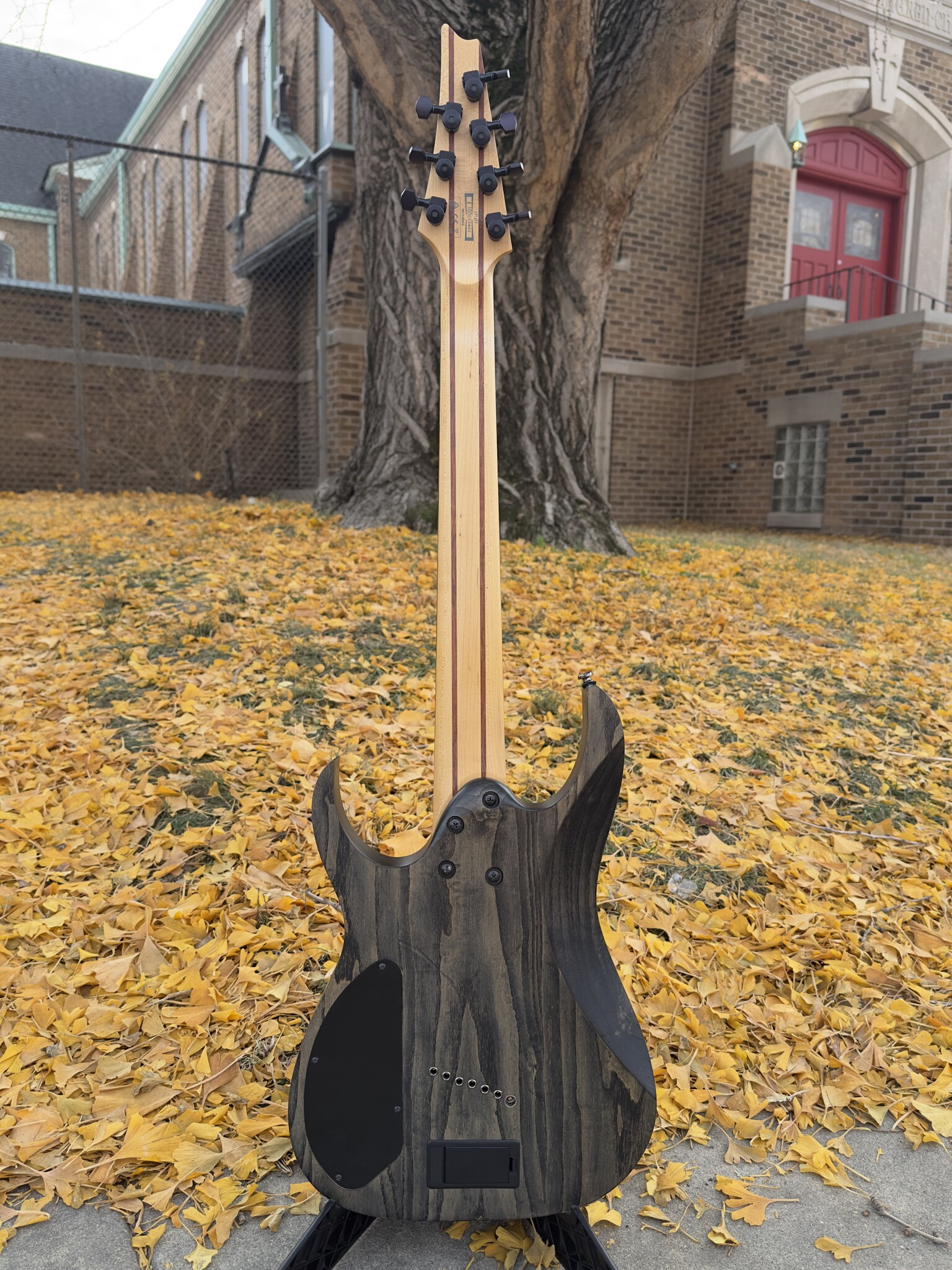This RGIF7 is a 7-string Multi-scale guitar featuring fanned frets, active electronics and locking tuners! IN addition to the design, the guitars features an ash body bolted to a maple and bubinga neck with a 24-fret rosewood fingerboard.
