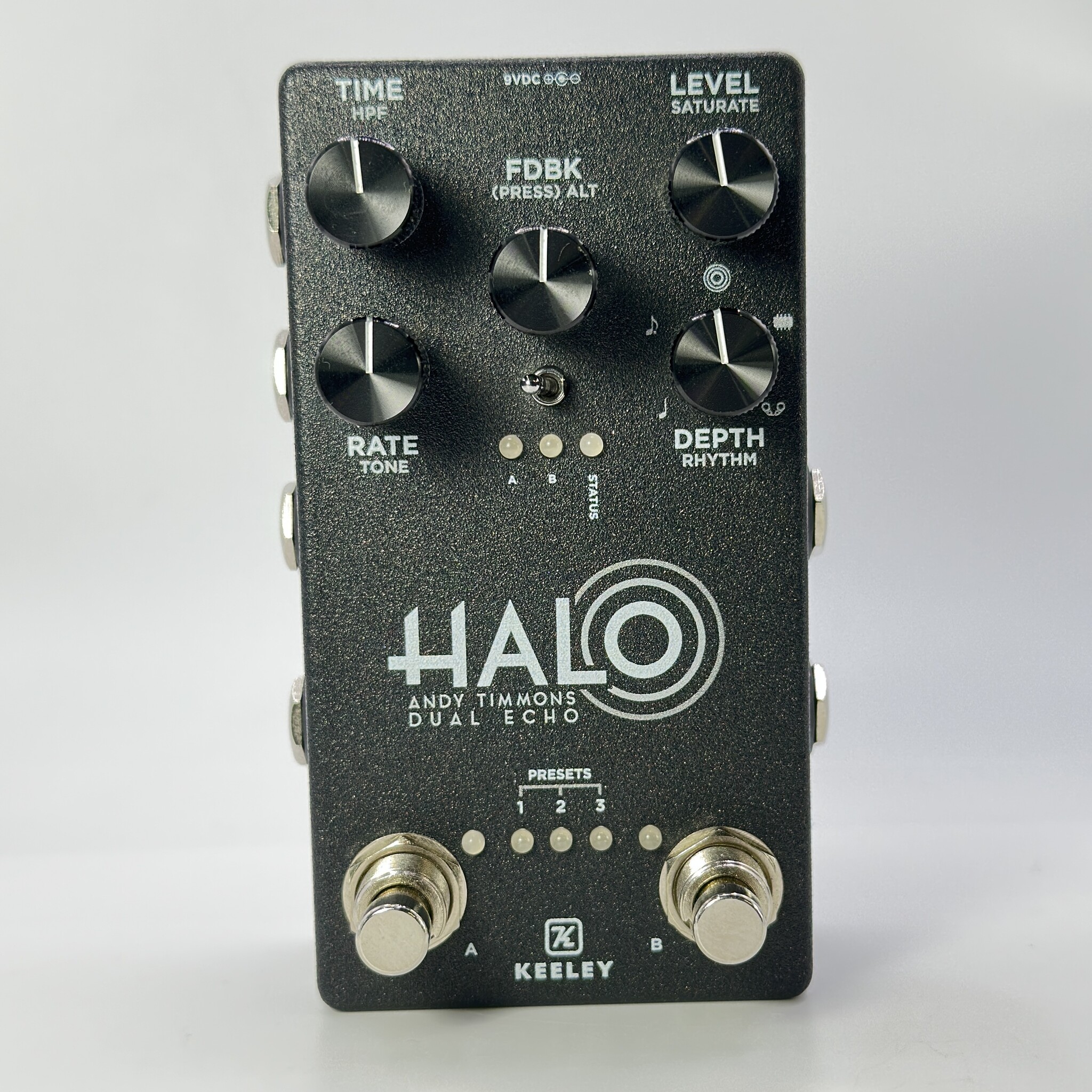 Notes from the HALO dance rhythmically, almost creating a reverb diffusion. Those notes are held together with tape-style effects like modulation, saturation and compression. The results are stunning. The pedal comes loaded with his signature delay tone and you can program your own sounds and save them as presets. Easily bounce between Side A and B on the fly, essentially giving you two delay pedals in one. In addition to Andy’s signature “Halo” sound, there are numerous other rhythmic delays including: quarter note, dotted 8th, stereo rack mount analog delay, and a vintage multi-head tape echo. Stunning stereo and pristine sound quality are further enhanced with controls for saturation, tone, and shelving filters that give you the ultimate delay pedal.