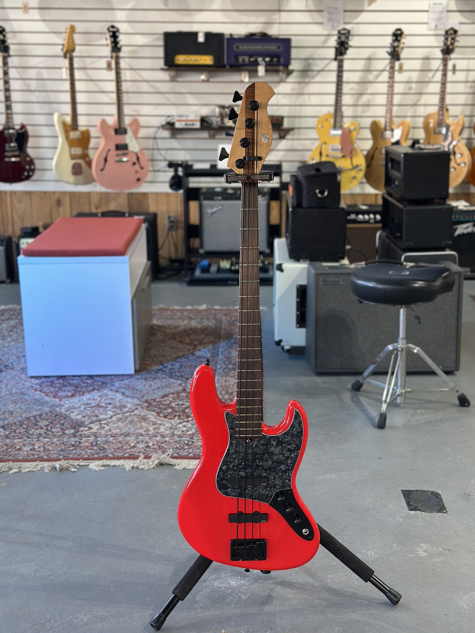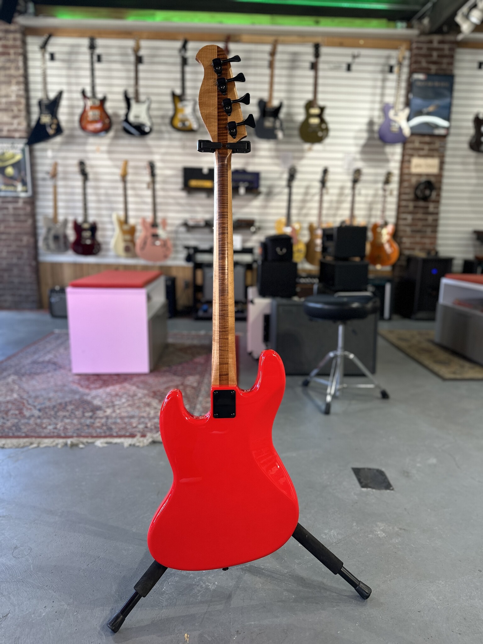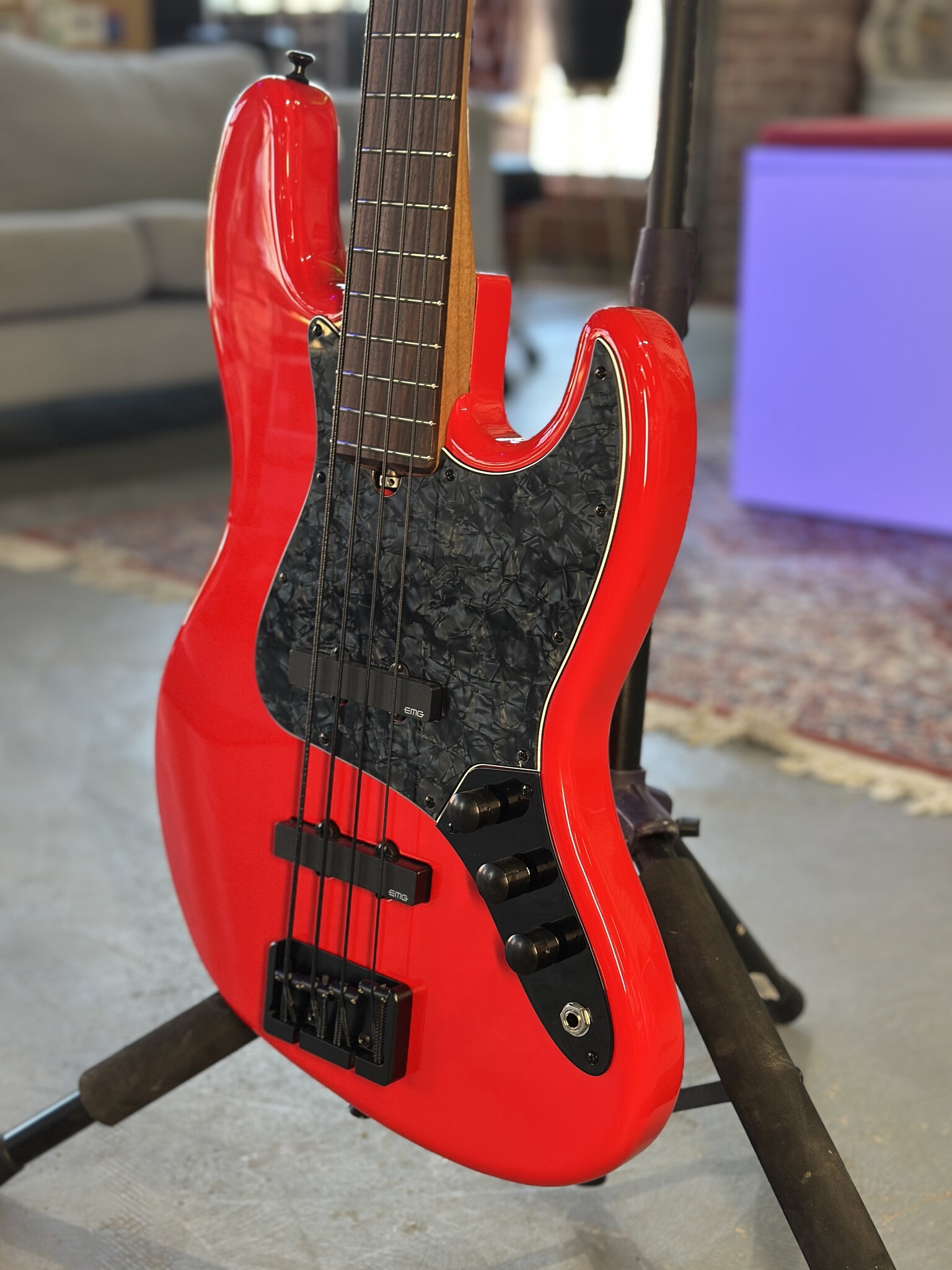 The body is made from Swamp Ash and has a bright red gloss finish custom made by Warmoth. The bass is equipped with EMG Passive JHZ Pickups and circuitry, “using stacked coils with ceramic and steel bar magnets for a traditional jazz bass sound with increased output, and low noise,” according to EMG. Solid Ebony Knobs Turned by David King (Portland, OR) top the traditional 2-volume 1-tone layout. Hipshot rounds out the hardware with a B-style bridge for precise intonation, while a sleek WD Music jet-black pearl pickguard protects your finish. Dunlop Strap Locks included.