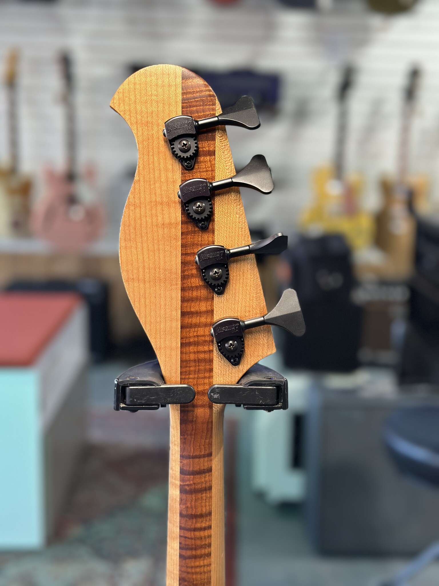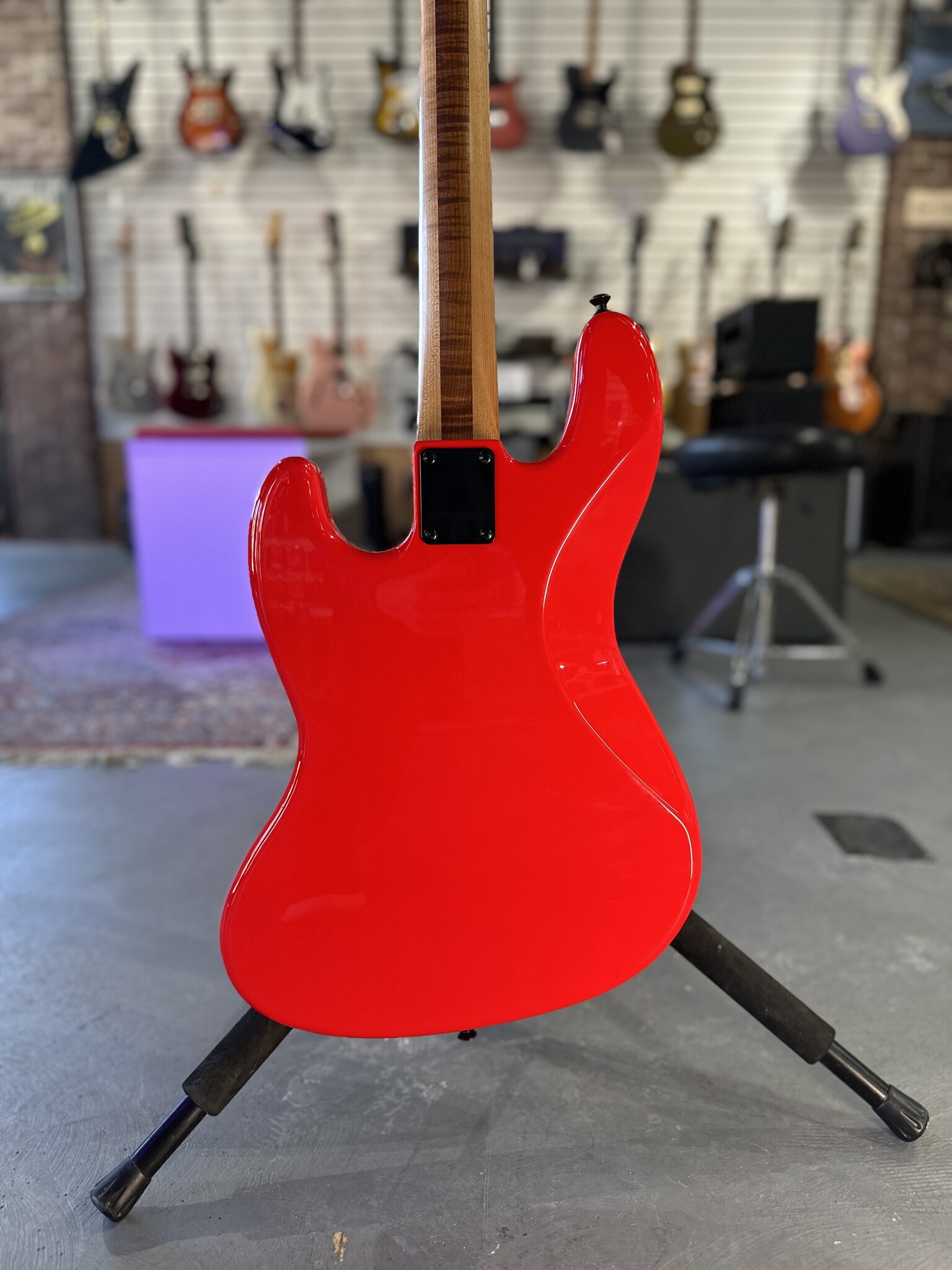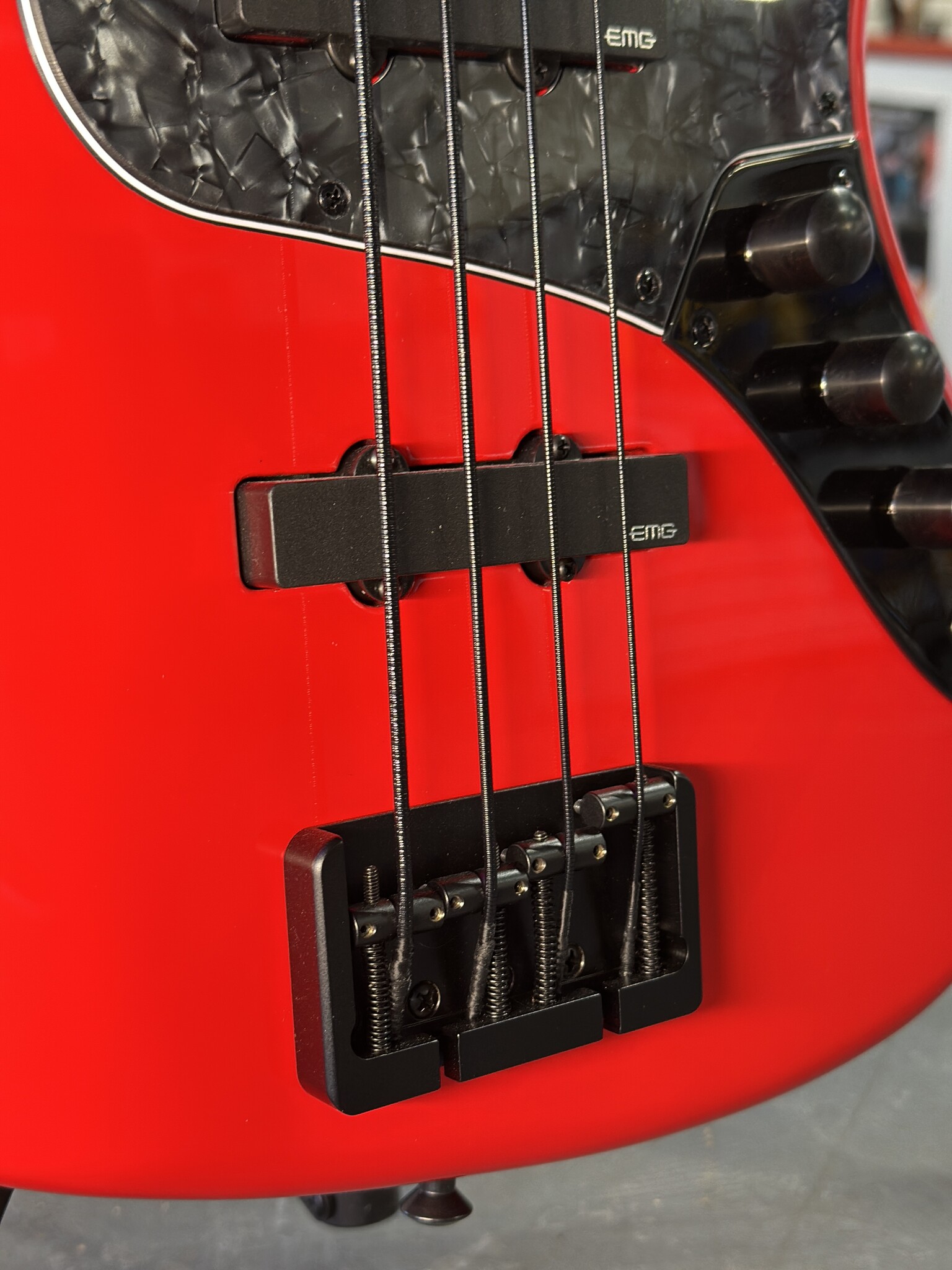 The body is made from Swamp Ash and has a bright red gloss finish custom made by Warmoth. The bass is equipped with EMG Passive JHZ Pickups and circuitry, “using stacked coils with ceramic and steel bar magnets for a traditional jazz bass sound with increased output, and low noise,” according to EMG. Solid Ebony Knobs Turned by David King (Portland, OR) top the traditional 2-volume 1-tone layout. Hipshot rounds out the hardware with a B-style bridge for precise intonation, while a sleek WD Music jet-black pearl pickguard protects your finish. Dunlop Strap Locks included.