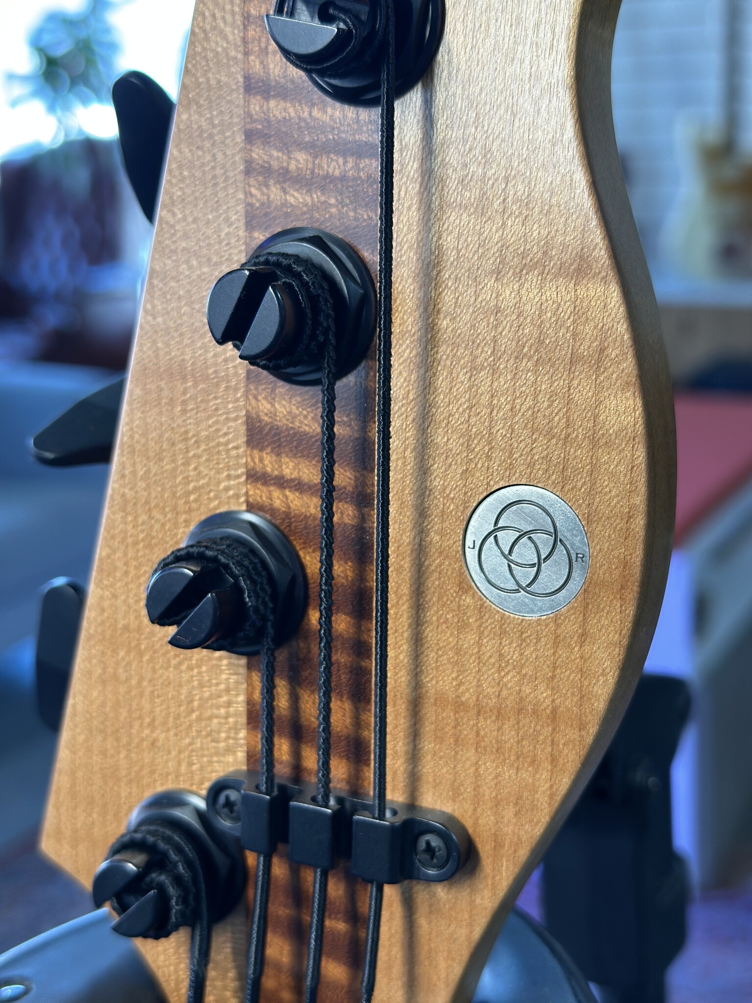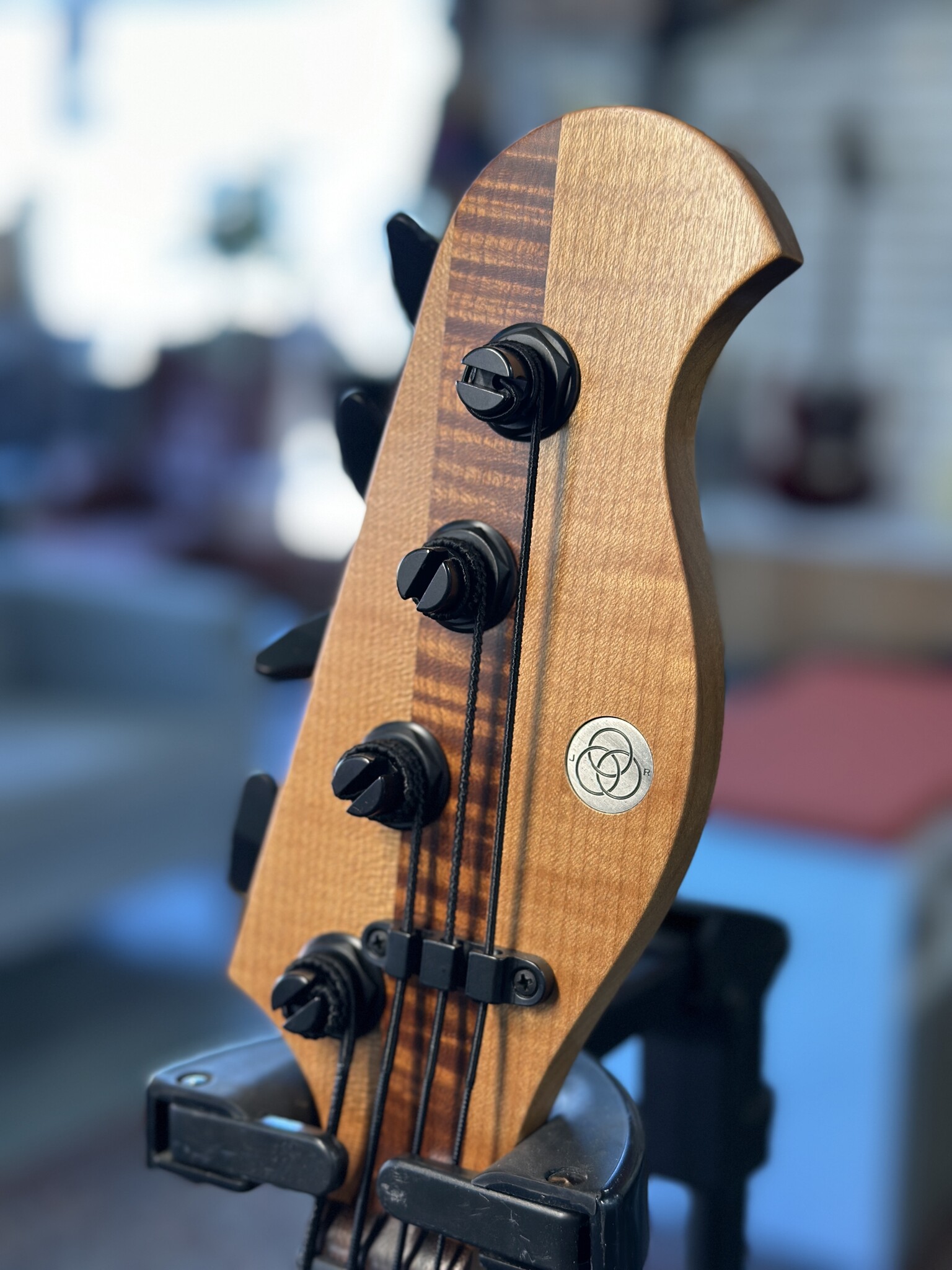 The Rihani Custom #016 features as 3-piece maple neck with hard, quarter-sawn baked maple outer laminations and a figured quarter-sawn baked maple center. This is topped by an Indian Rosewood Fretboard with a 16” radius and modern “Jumbo” 0150 nickel frets. There are no face fret markers, rather white composite side dots on a “Chunky Monkey” neck carve. The bass has a black TUSQ nut and a Hipshot string retainer USA Y-paddle Tuners.