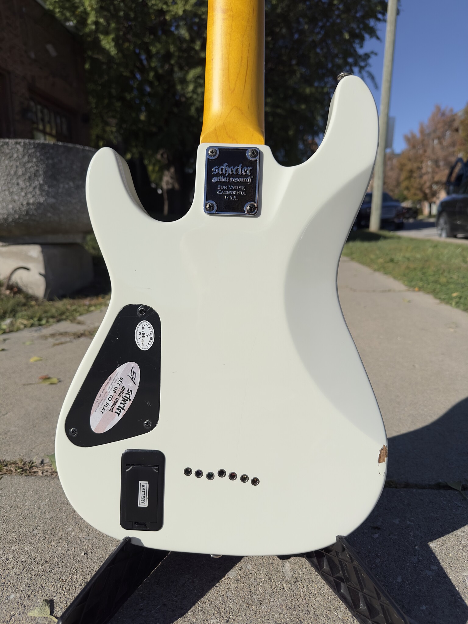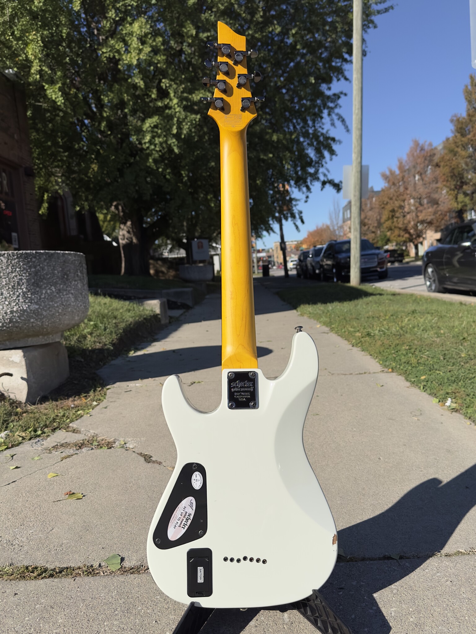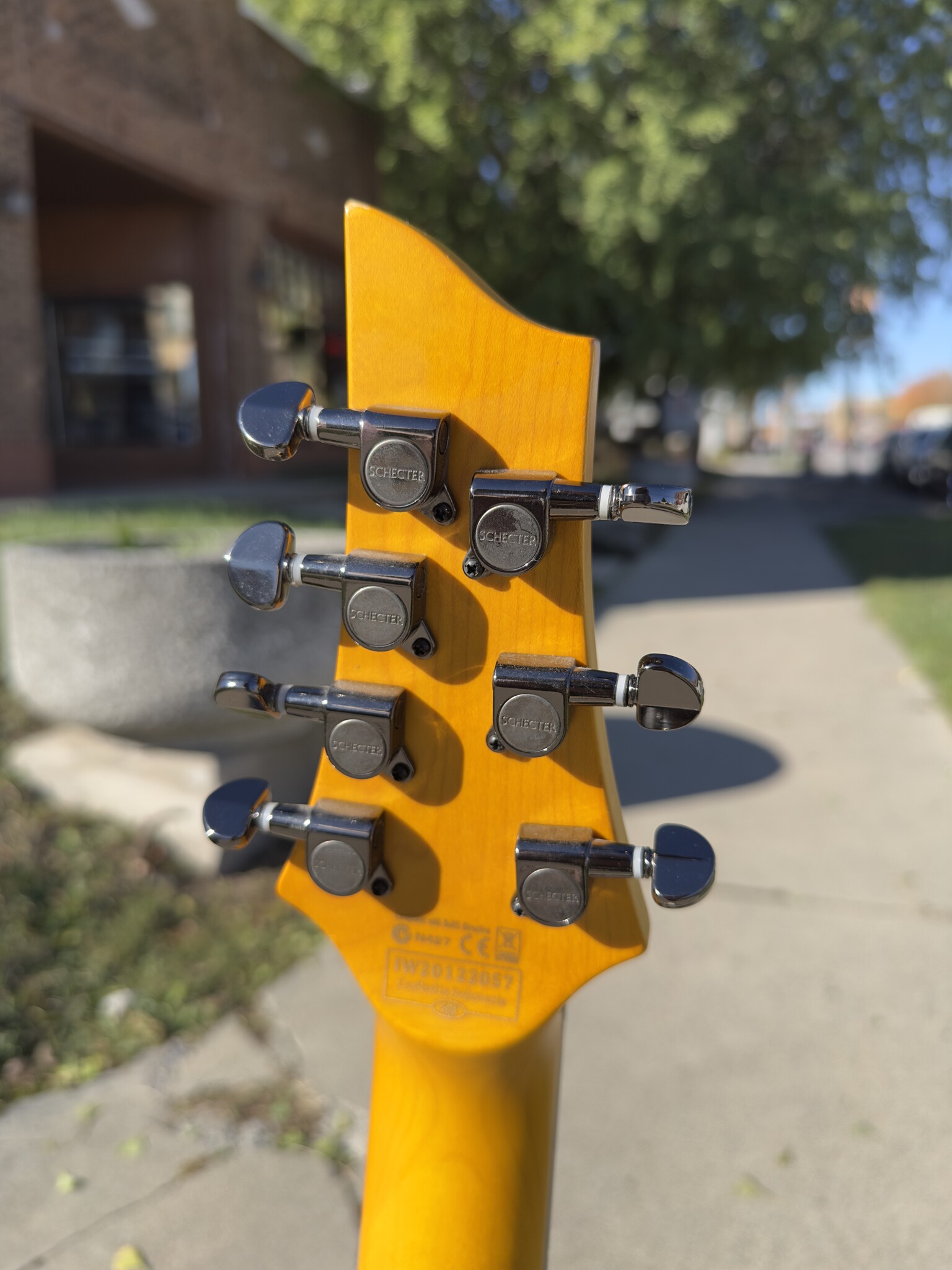 This guitar is used and shows some signs of wear, a large ding is featured on the back of the body and headstock. This guitar includes a gig bag and weighs in at 8.2lbs. Here's more info from Schecter: