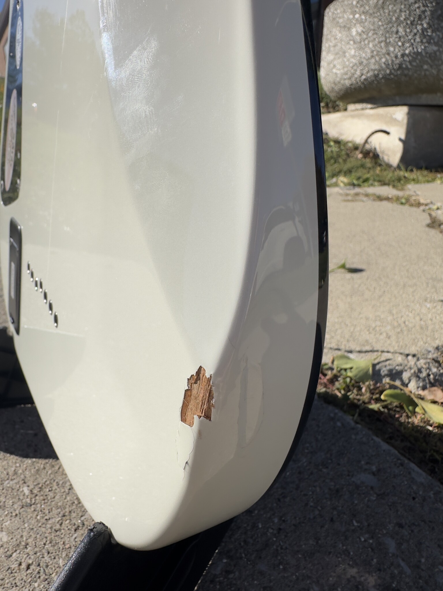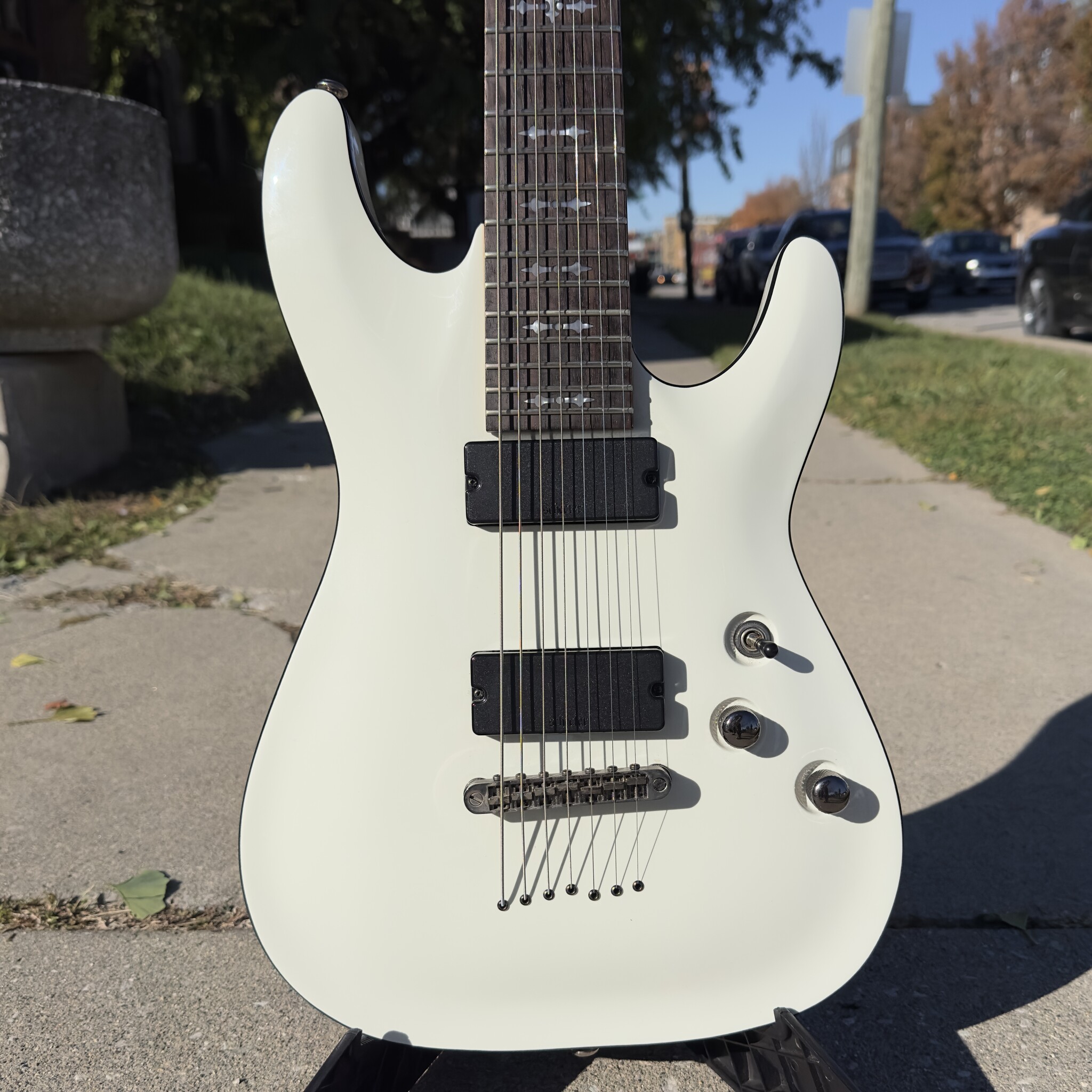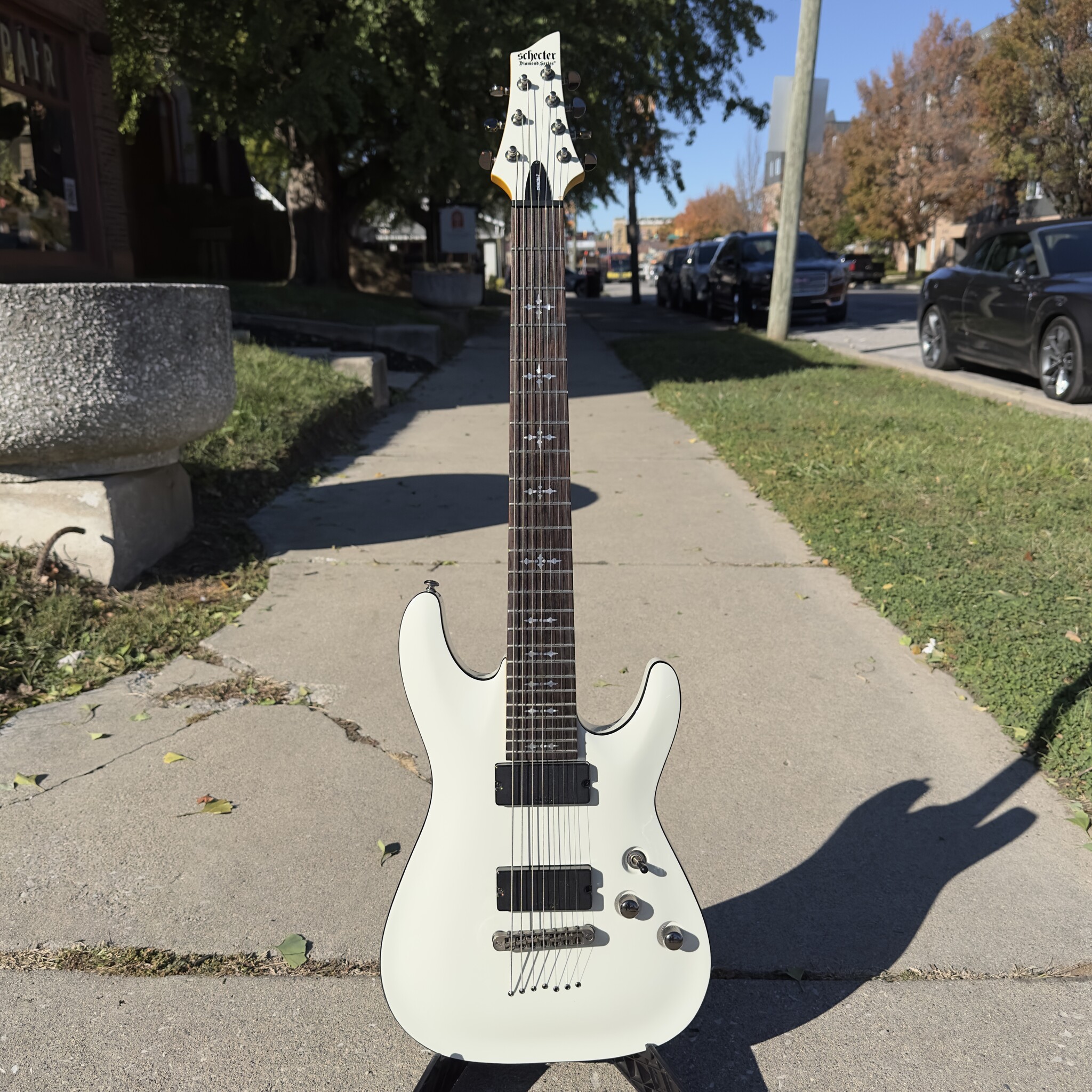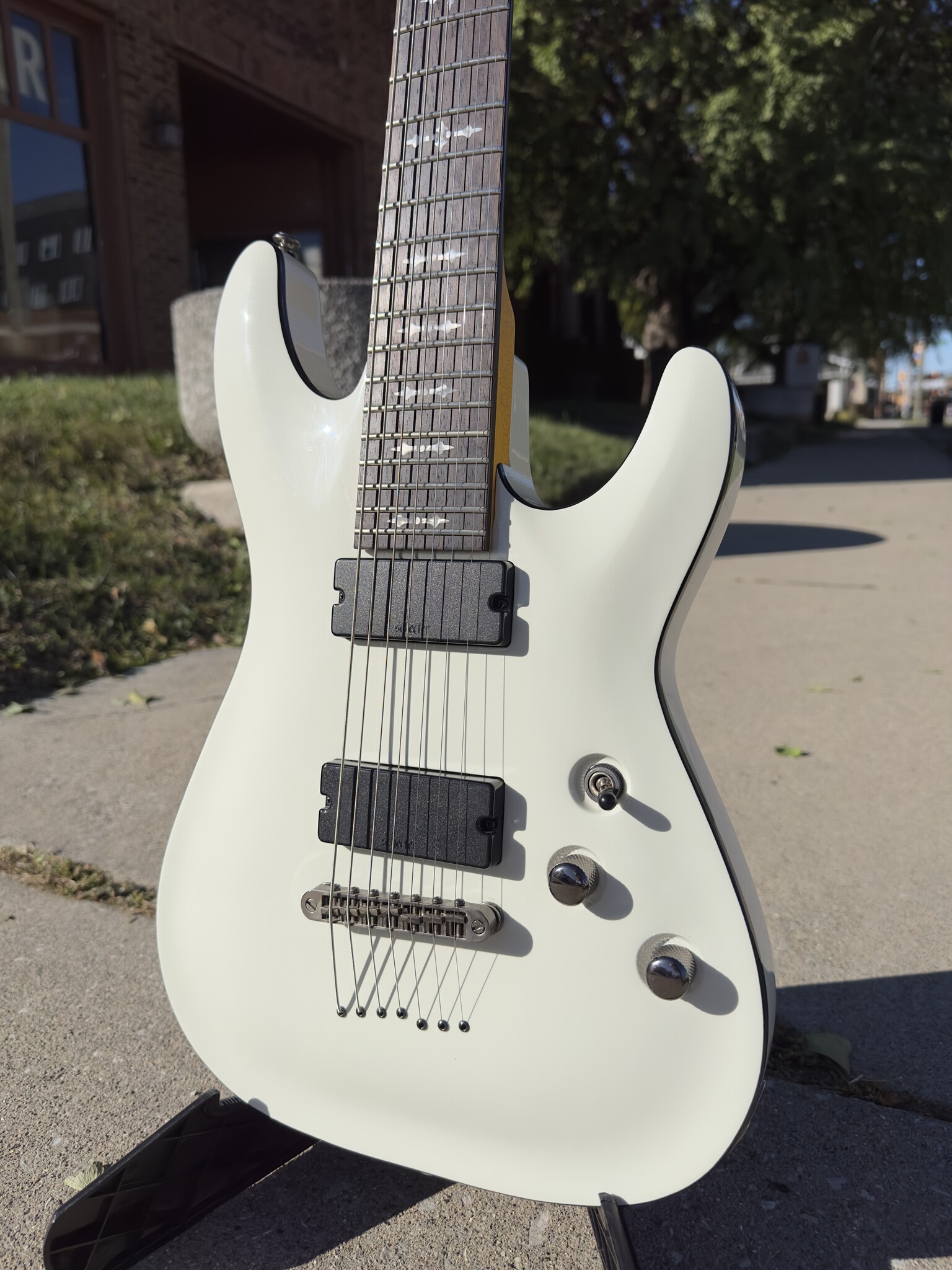 This guitar is used and shows some signs of wear, a large ding is featured on the back of the body and headstock. This guitar includes a gig bag and weighs in at 8.2lbs. Here's more info from Schecter: