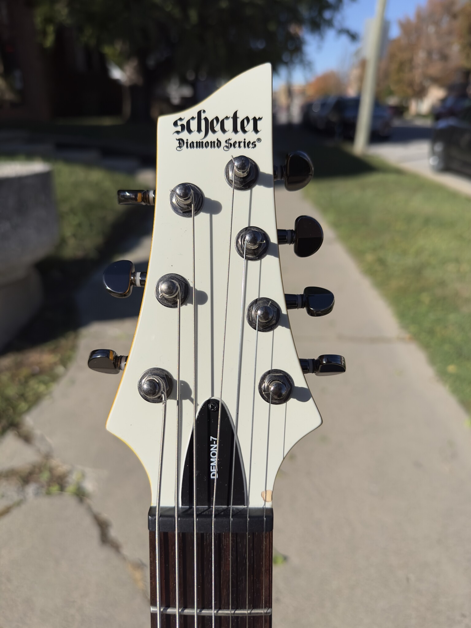 This Demon-7 guitar is a beast with a dark and mysterious vibe with its Gothic Cross inlays on the wenge fretboard. The bolt-on maple neck has a slim "C" shape and 24 jumbo frets, making it perfect for shredding. With Schecter's Diamond Active HB-105S humbuckers and a 26.5" scale, this guitar delivers crushing tone. The black chrome hardware and arched top body made of basswood add to its aggressive look. Plus, the Custom Hardtail bridge with string-thru-body design gives it sustain and stability for face-melting solos.
