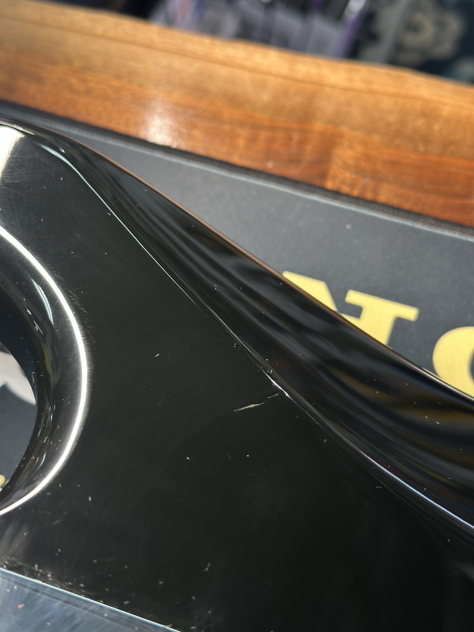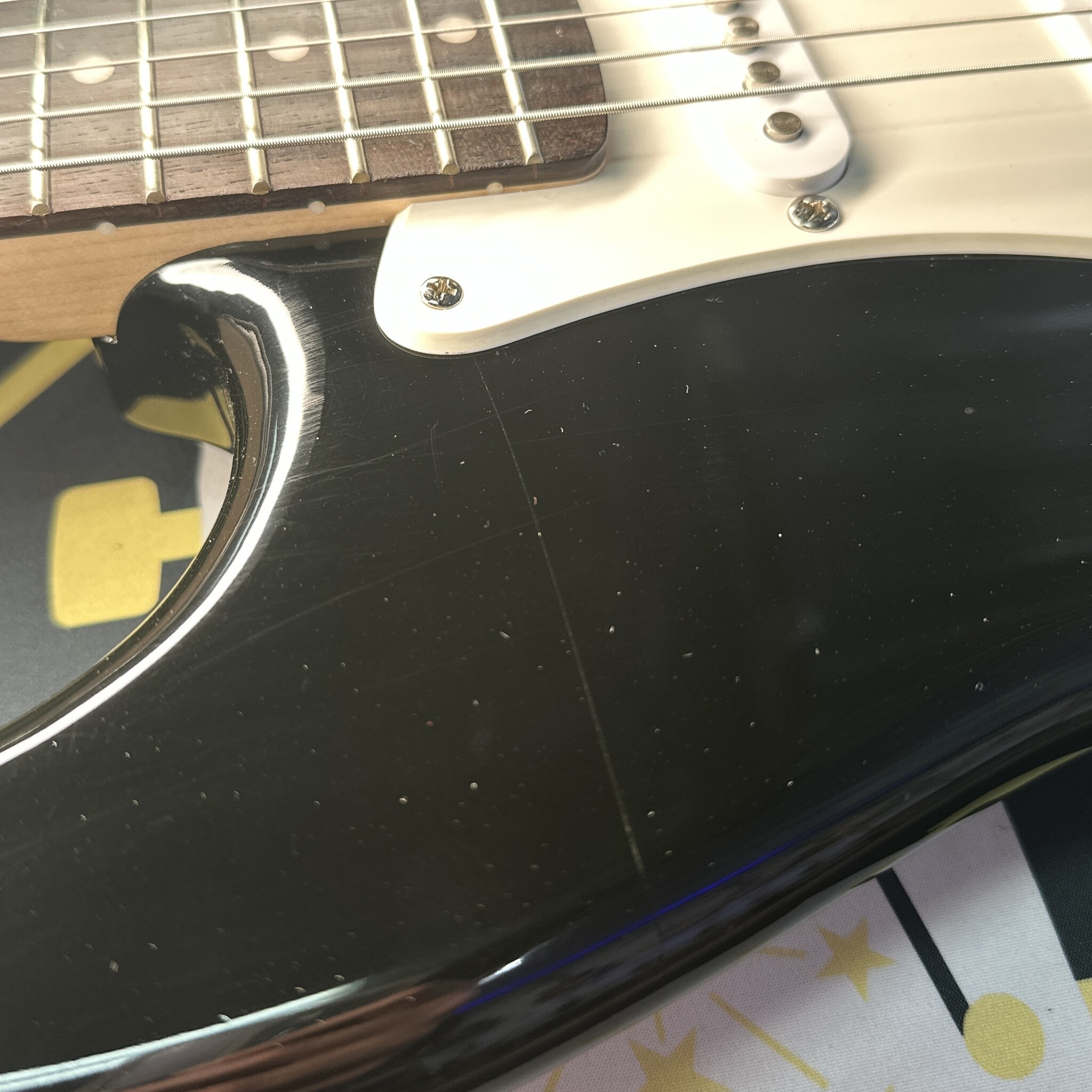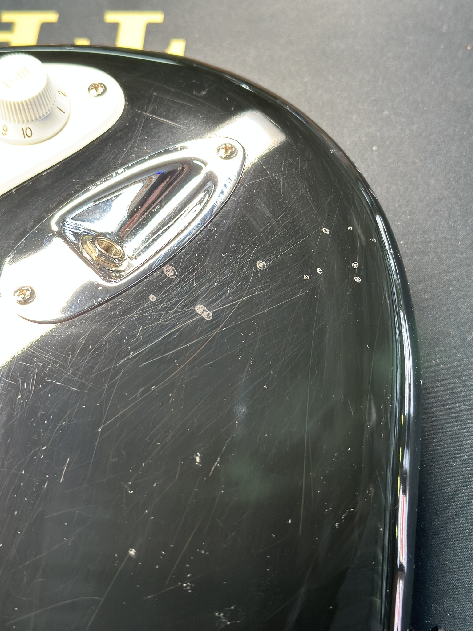 This guitar is in great condition with light wear. The back plate has been replaced with a black plate and there is a few finish blemishes, pictured, most notably the finish has sunk into what appears to be a glue line or finish crack. There is also a ding and some finish spots by the jack, pictured. This does not effect the guitars playability.