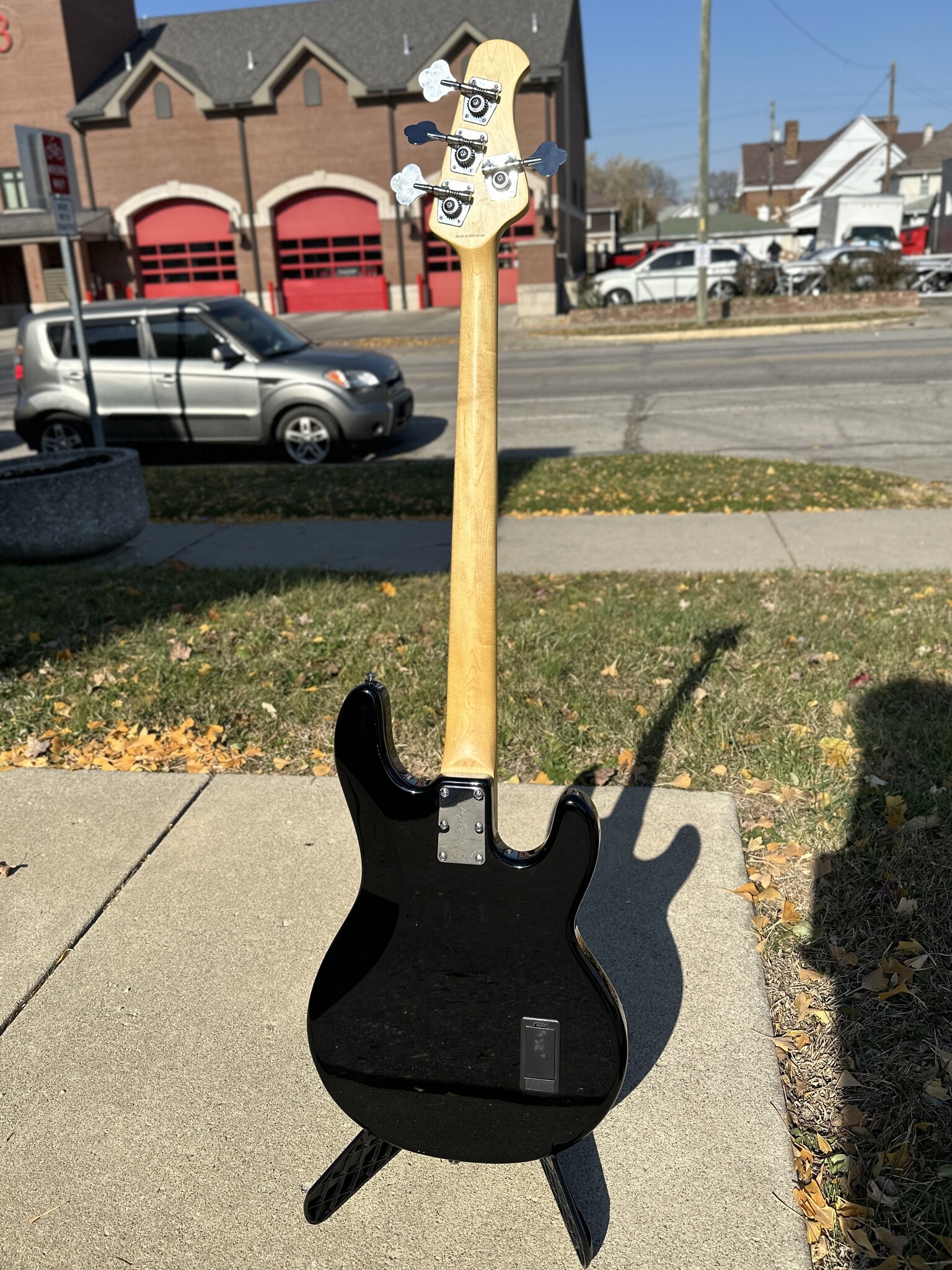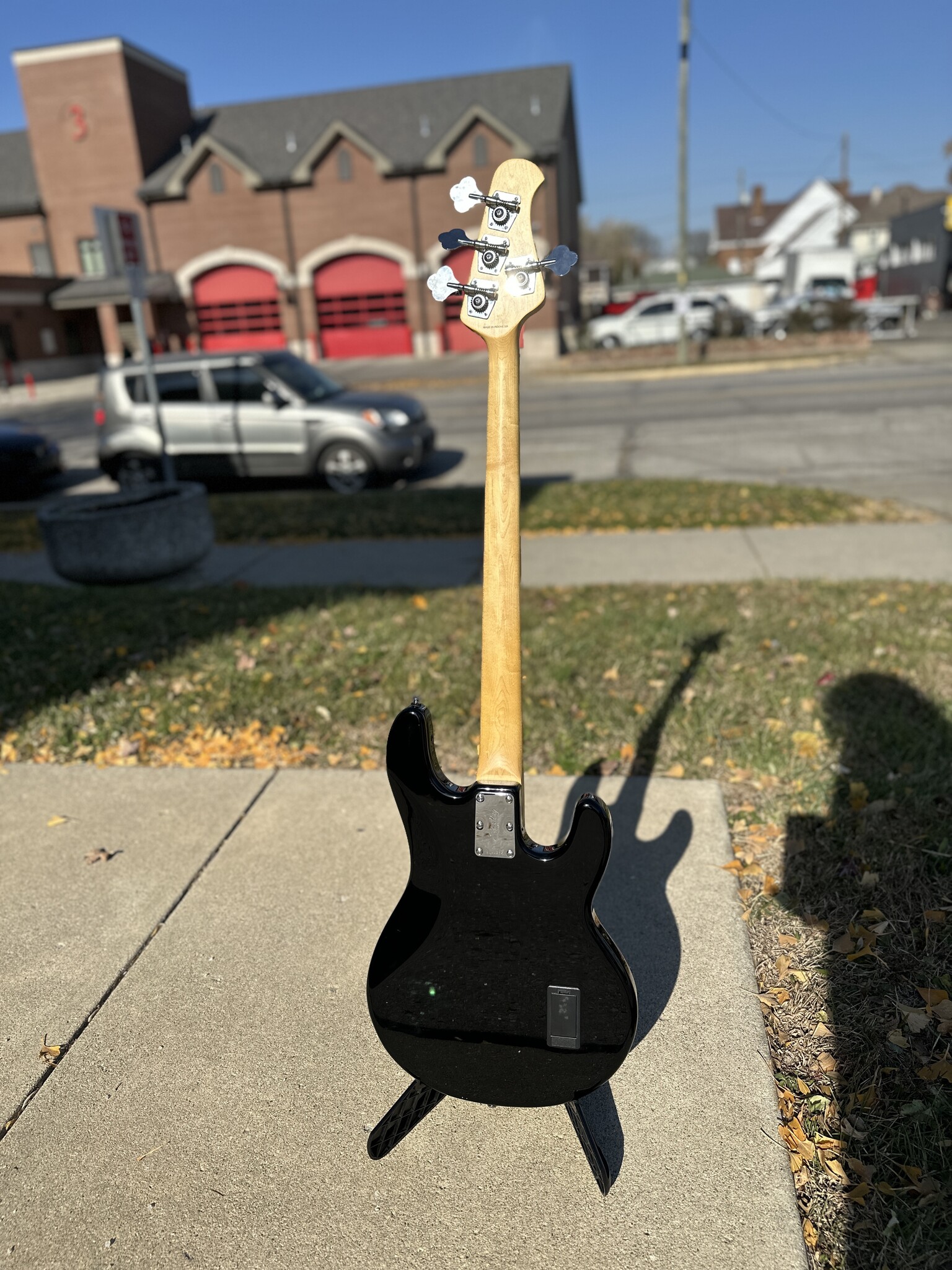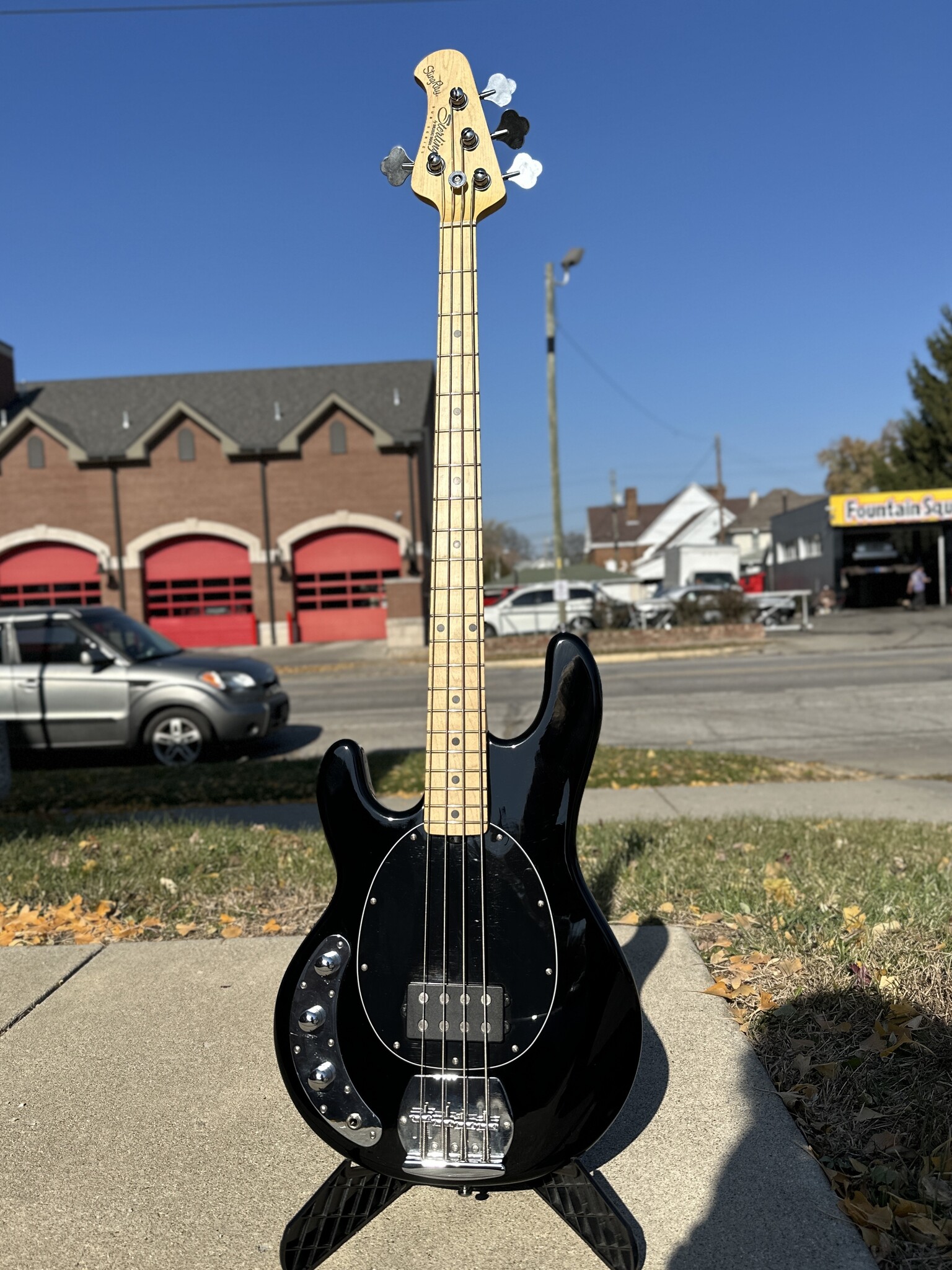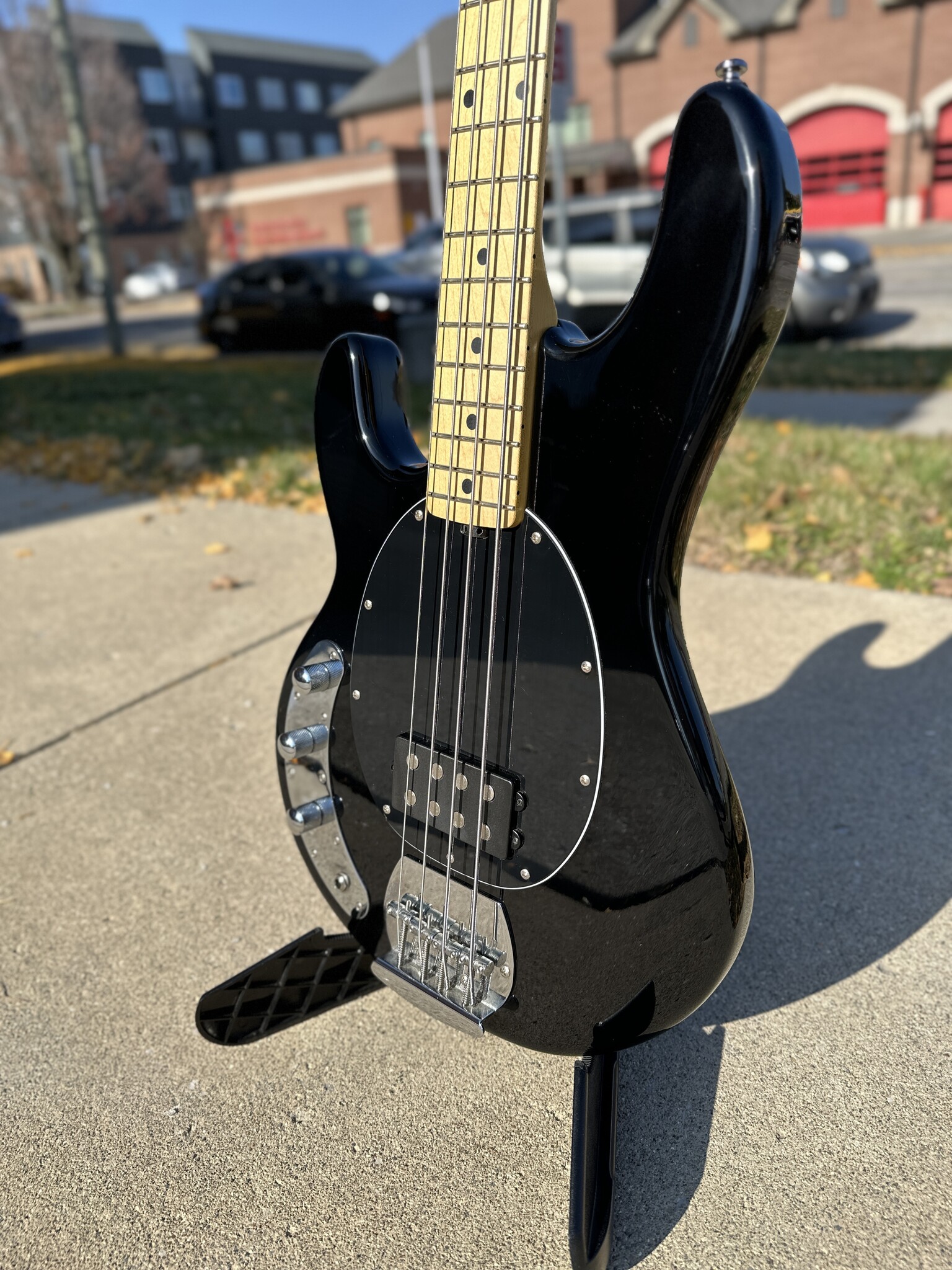 The left-handed StingRay RAY4 bass features a 9v active preamp, a low-noise humbucking pickup, and a fully adjustable heavy duty