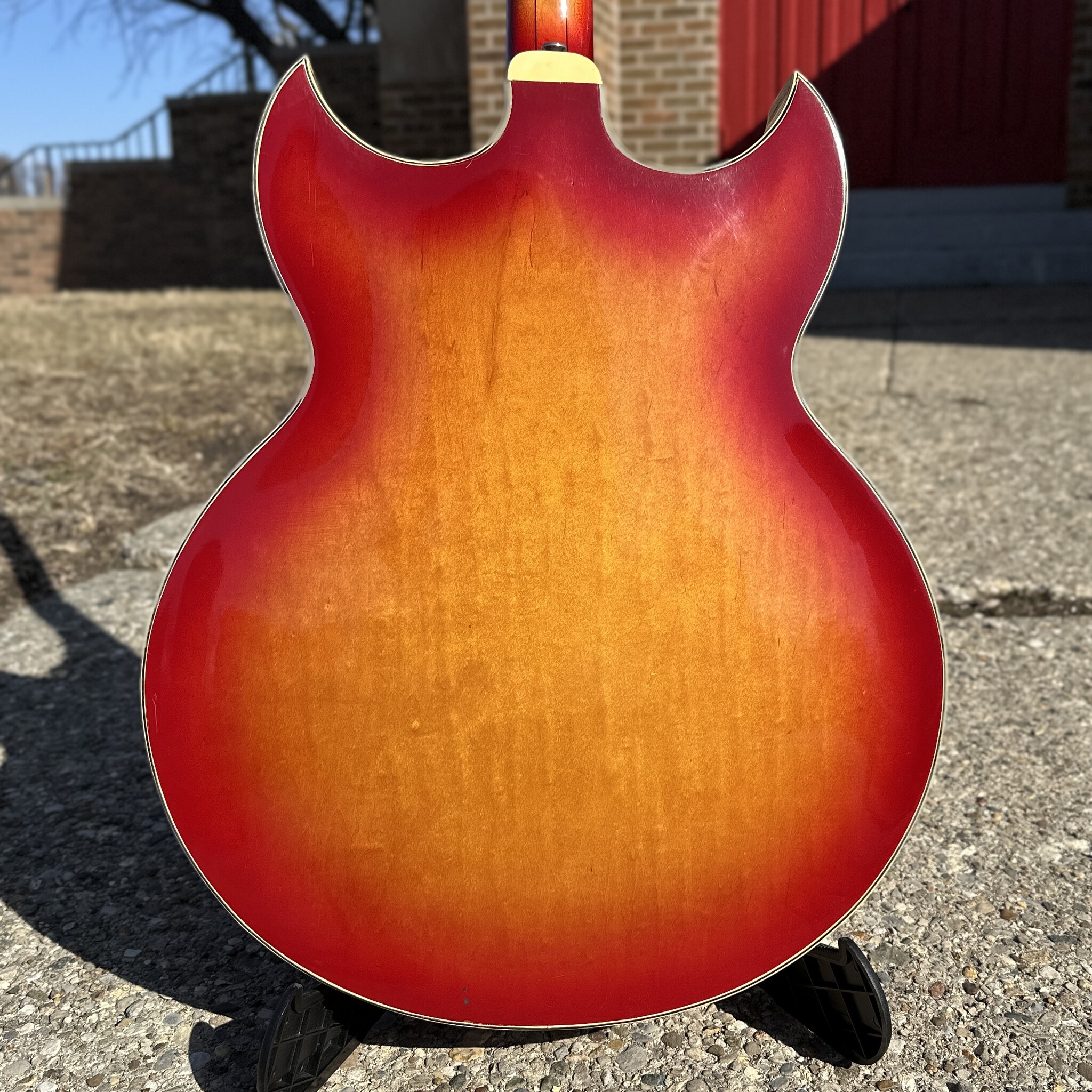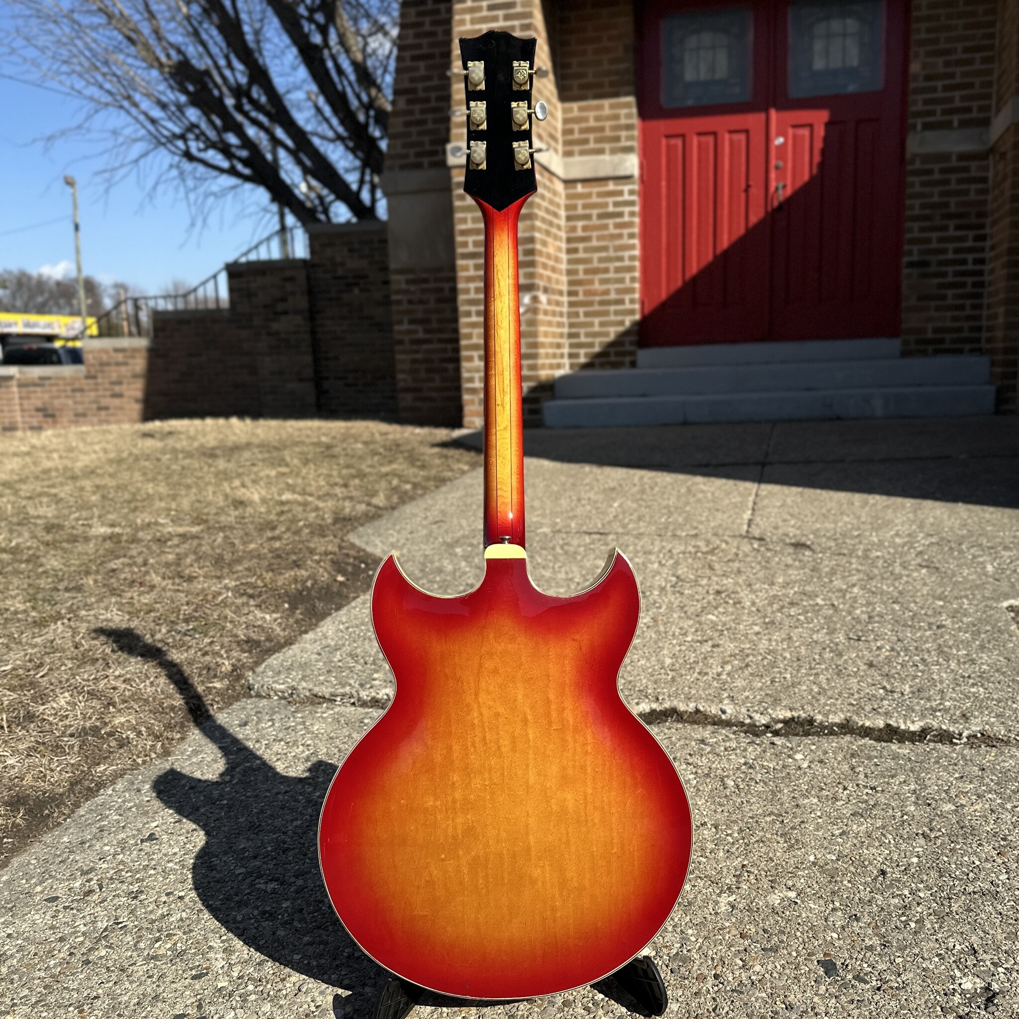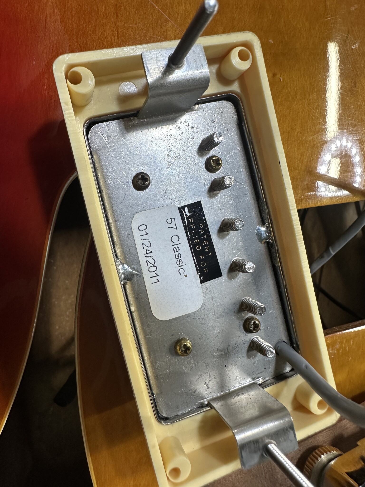 This guitar has a few modifications from the original model. The original pickups and rings have been replaced. In the neck is a reissued Guild HB-1 and a Gibson '57 Classic in the bridge position. A new switch has also been installed. The original roller bridge has been replaced with an arch top tun-o-matic style bridge. The original pickguard is missing and the bridge has been replaced.