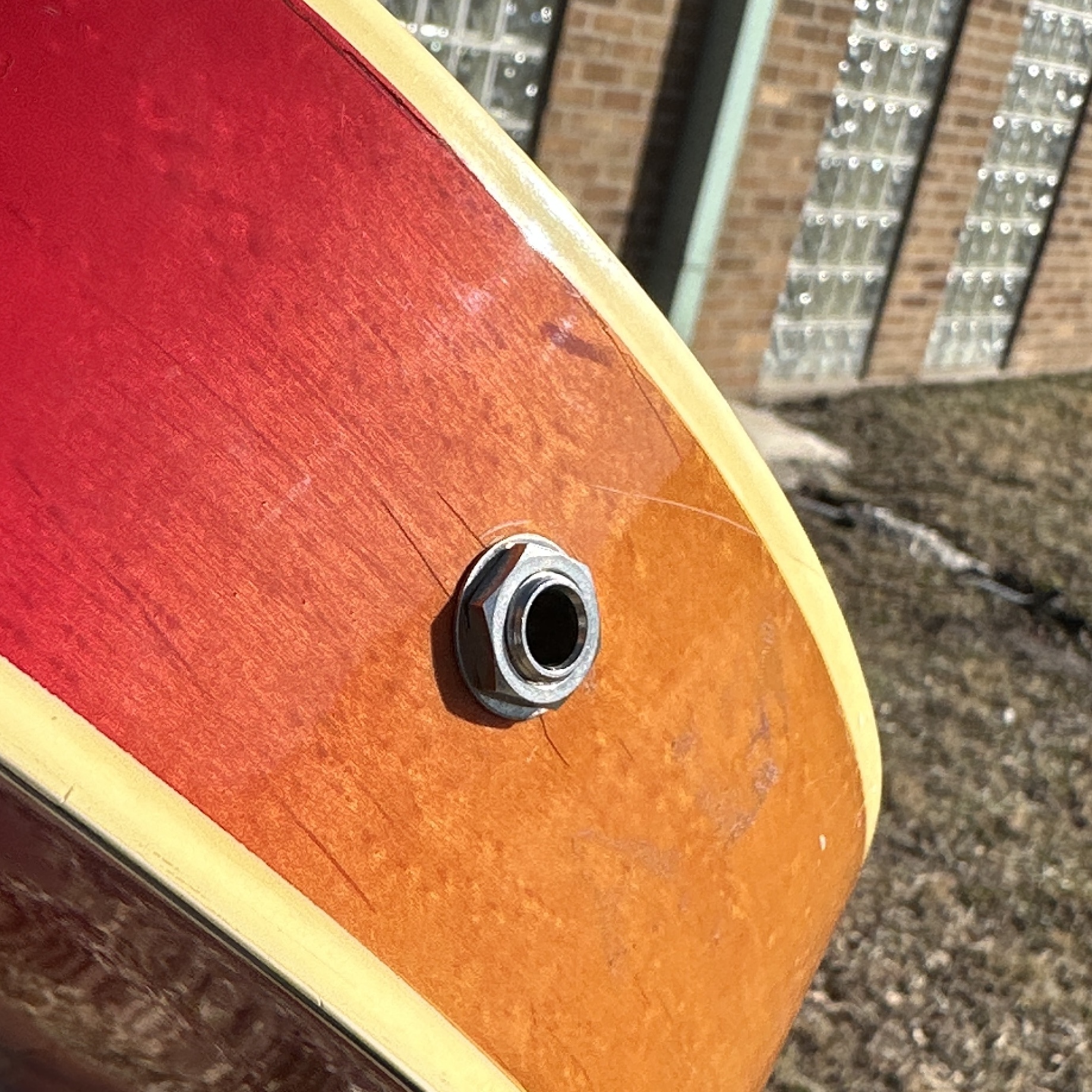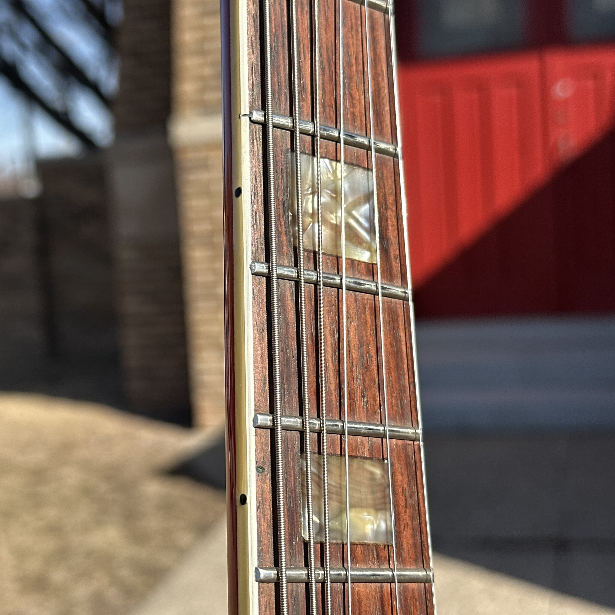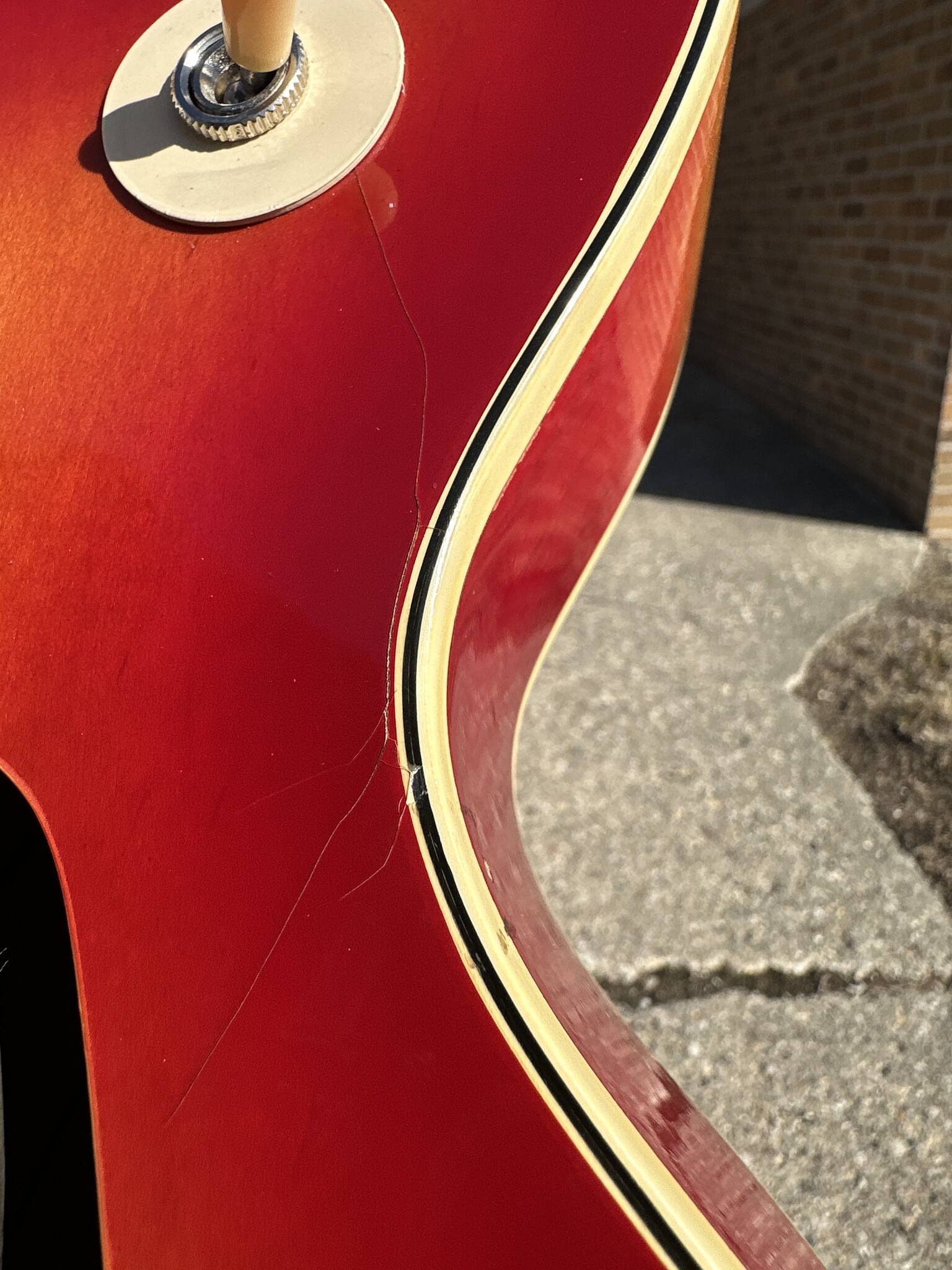 There is some light cosmetic where from being played over the years; tarnishing to the gold hardware, light checking, screw holes from missing pickguard, light fret wear that is visible but doesn't effect playability (and with room for a fret dressing). There was a binding crack on the heel that has been stabilized.